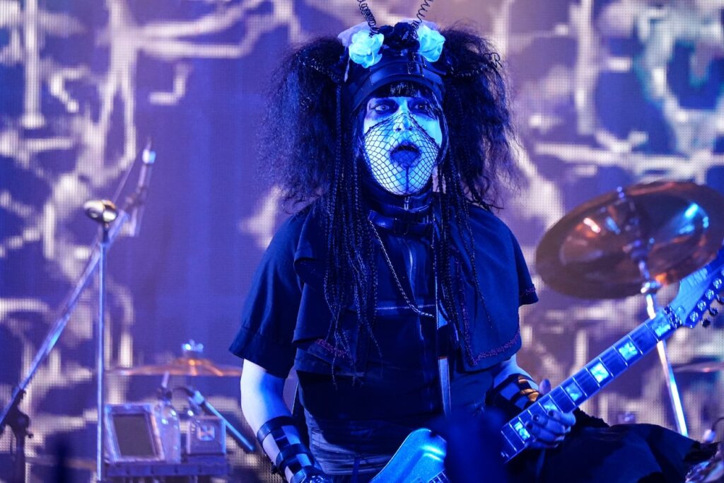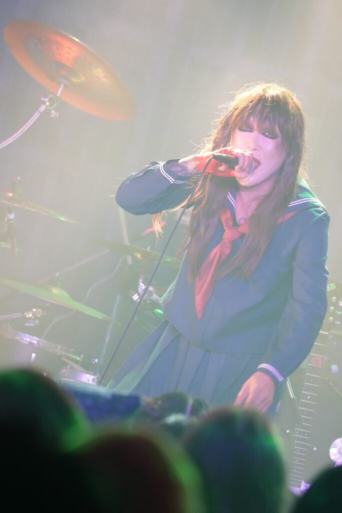 荒々しいドラムビートを合図に、Köziが観客たちを煽りだす。ここからさらに攻撃の手を強めるように、ソリッドなギターの音が身体中をグサグサと突き刺しだす。その上で、Köziがおおらかな声で『バラクーダ』を歌いだした。ゴスでダークな、まるで世紀末のサバトの様相を呈した楽曲の上で、儀式を司るような演奏と歌が響き渡る。荒れ狂う演奏に乗せ、Köziが雄々しき様で、観客たちを煽るように歌っていた。その刺々しい声がグサグサと心に刺さるたび、気持ちが高揚していく。イカれたように、フロア中がカオスな色に染まってゆく様が最高だ。