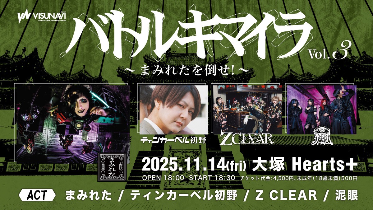 VISUNAVI Japan主催「バトルキマイラ」第3弾!11月14日(金)大塚Hearts +ヘッドライナー<まみれた>に牙を剥くのはSNS公募で対戦要求した<Z CLEAR>、<泥眼>、さらに“バトル・●●●”でお馴染み<ティンカーベル初野>も参戦!
