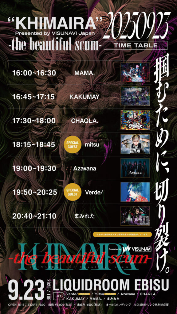 Azavana / KAKUMAY / CHAQLA. / MAMA. / まみれた「KHIMAIRA」9.23恵比寿リキッドルーム進出!Verde/、mitsuをヘッドライナーにAzavana、CHAQLA.、KAKUMAY、MAMA.、まみれた 7組のイデオロギーが激突!