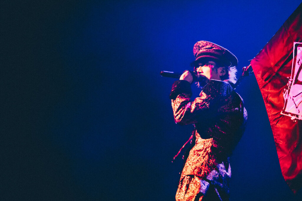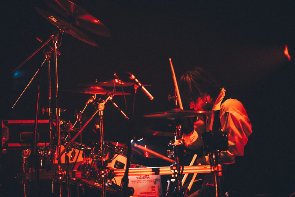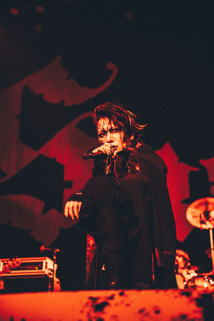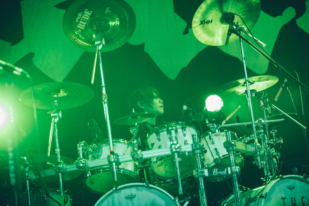 攻撃的なサウンドと悲哀を帯びたメロディの「Rosario-ロザリオ-」、トリッキーなリズムパターンと様々な声色を使い分けるヴォーカルアプローチが光る「Payment of vomiter」、ステージが真っ赤に染まる中、ドラミングを合図にバックライトが瞬き、バンドインする演出がドラマティックだった「Jealousy」と、中盤では魅せるナンバーが並んだ。