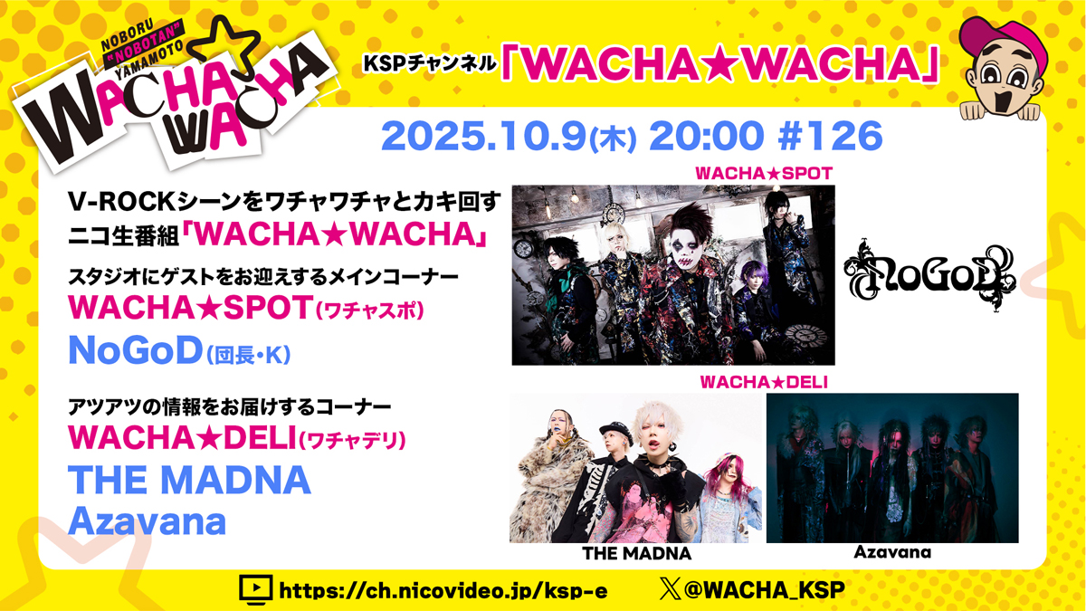 【WACHA★WACHA】<ニコ生番組>V-ROCKシーンをワチャワチャとかき回す生放送★2025年10月9日(木):NoGoD(団長・K)がスタジオ生出演!THE MADNAとAzavanaのコメント動画も!