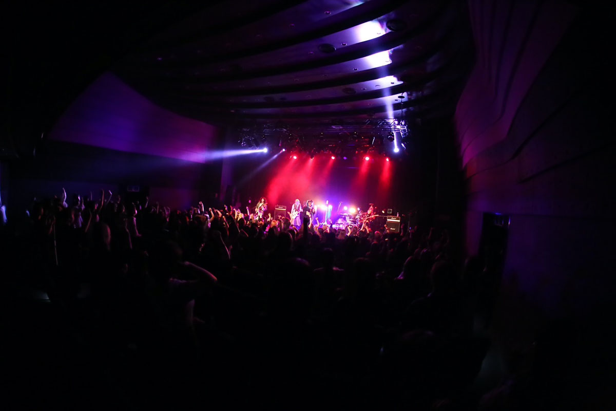 収容人数320人の渋谷PLEASURE PLEASUREは道玄坂の中腹のビルの上階に位置する2階構造のホールだが、もともと映画館だった会場は傾斜のついたフロアと座り心地の良い座席が居心地のよさと同時に激しいライヴに似つかわしくないエレガントさも感じさせる。