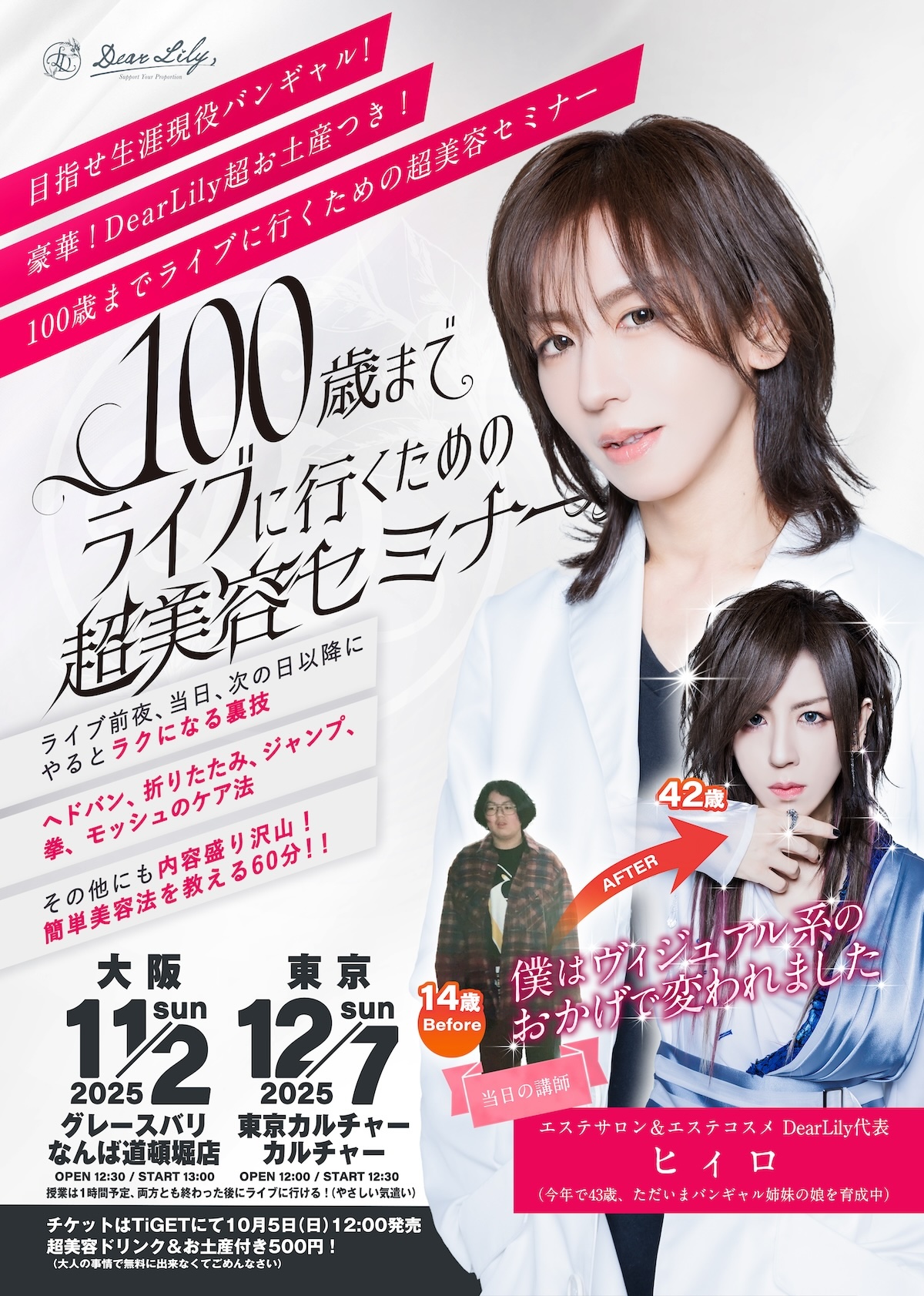 【ヒィロ(ex.ν[NEU])】生涯バンギャルを応援する“100歳までライブに行くための超美容セミナー”が大阪と東京にて開催!チケット代はお土産込み500円!チケット一般発売は10月18日(土)20時より開始!!