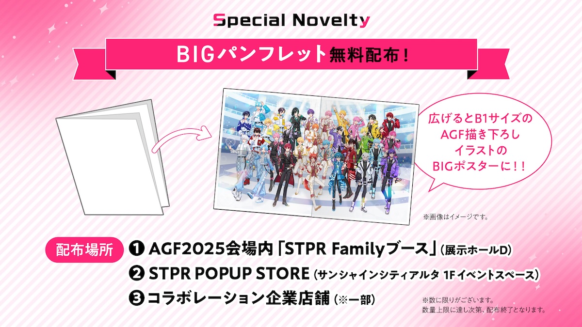 AGF2025に初出展するSTPRは、メイン会場で最大規模のブースを展開。ブースでは、グッズの先行販売をはじめ、展示やオリジナルノベルティ配布を実施する。