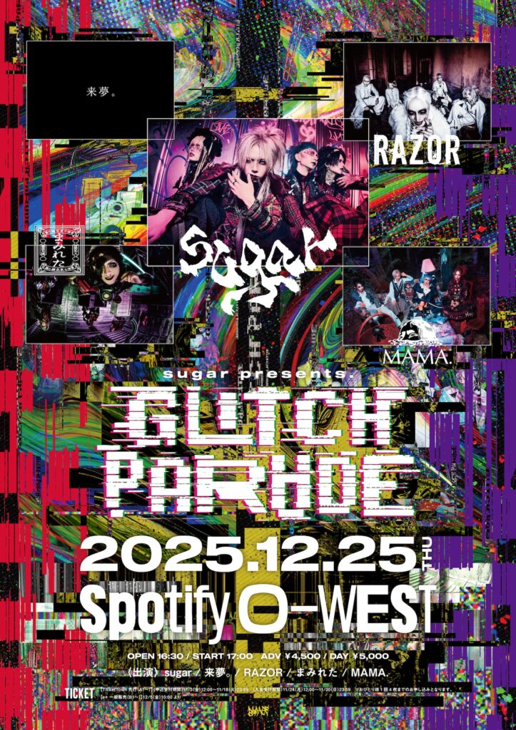 ヴィジュアルロックバンド・sugarが、主催イベント「GLITCH PARADE」を12月25日(クリスマス)に東京・Spotify O-WESTで開催する。