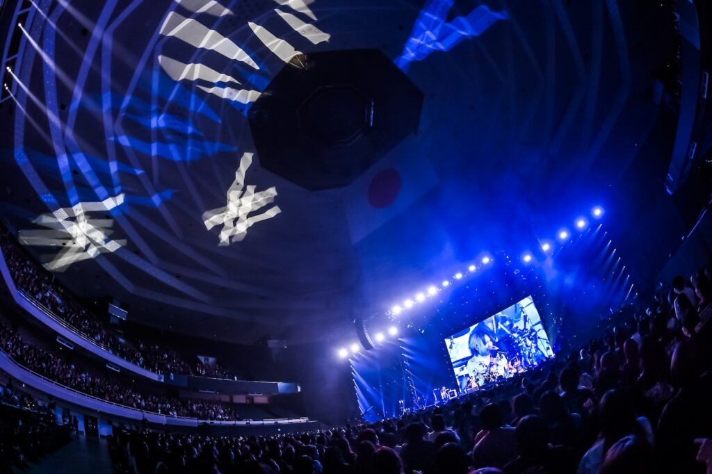 そして、完璧でヤバ過ぎる出落ちを笑顔で演じきった5人が程なく各ポジションにつき、今宵まず演奏しだしたのは「Believe」。2003年8月にリリースされたメジャーデビュー曲をいきなり幕開けに持ってくるとは、これまたなかなか粋なことをしてくれる。しかも、舞台奥に設置された巨大スクリーンにはリアルタイム映像とともに当時のMVも挿入されるかたちで映し出され、それも実に感慨深い光景だったかと。