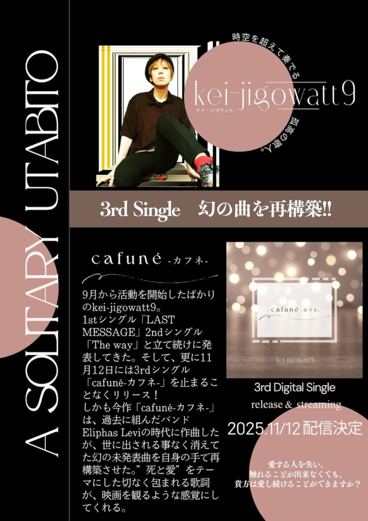 そう深い言葉を打ち出した今作「cafuné-カフネ-」は、90年代に組んでいたバンドEliphas Leviを活動してた時期に作曲したが、世に出される事なく消えてた幻の未発表曲をkei-jigowatt9自身の手で再構築させた一曲。