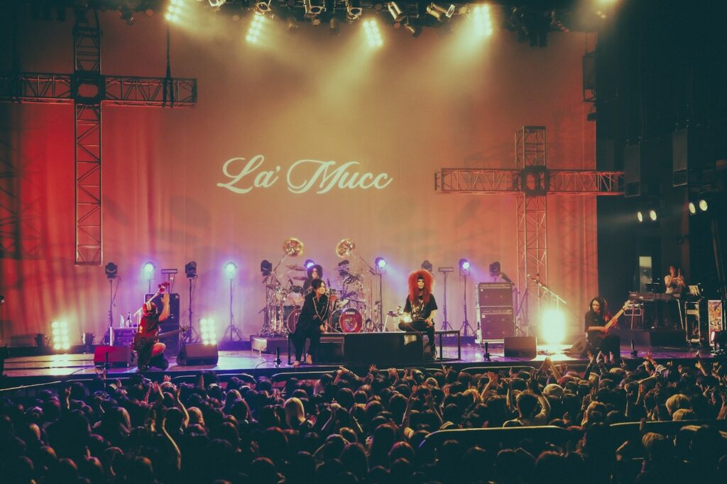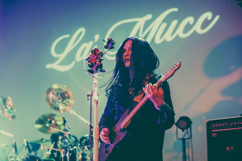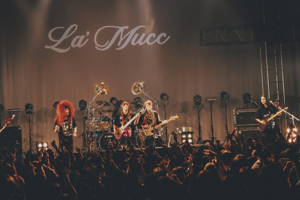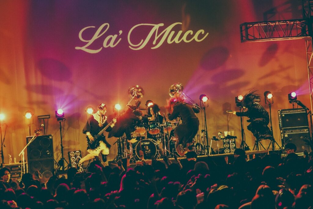 ほどなくして、輝度が落とされた照明の中で荘厳なカンタータ『カルミナ・ブラーナ』の「O Fortuna(おお、運命の女神よ)」がSEとして流れだすと、生ける化石と呼んでもいい伝説のバンド・La'Muccが遂に姿を現し、貫録ある面持ちでプレイし始めたのは何故かMUCCの「愛の唄」。