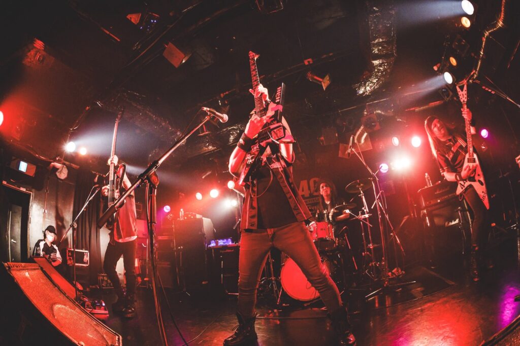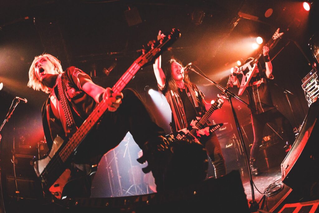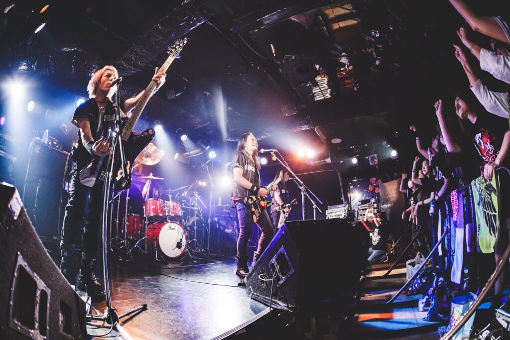 そんな彼らが、いきなり冒頭でブチあげてくれたのはメタルファン以外にも認知度の高い「みかんのうた」。このとき客席フロアではマシンガーと呼ばれるファンが激しいヘドバンをかましていただけでなく、サビでオーディエンスの多くが〈みかん!みかん!みかん!〉とおおいにフィストアップして盛り上がることになったのは言うまでもなかろう。