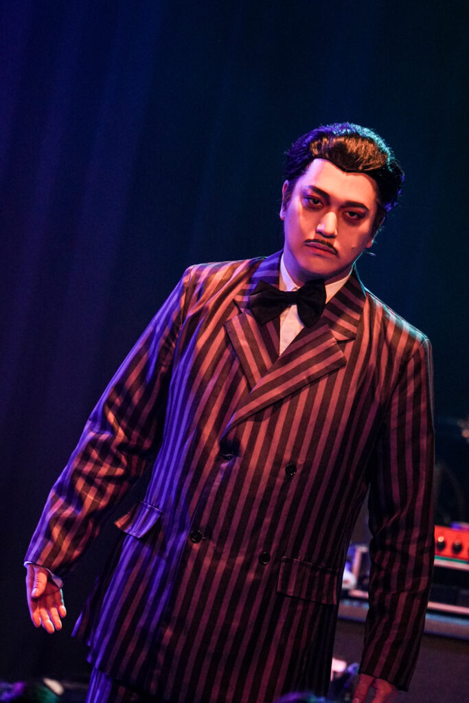 擬態ぶりが凄過ぎて、開演前の楽屋ですれ違った時には誰が誰だか全くわからなかったのだが。団長からの紹介を受けて、彼らが『アダムスファミリー』のテーマ曲とともにステージに上がってきた時に、ようやくあれがDuelJewel御一行様だったのかと判明して筆者は横転した次第である(笑)。隼人=ウェンズデー、Shun=モーティシア、祐弥=ラーチ、Natsuki=パグズリー、ばる=ゴメズ。中でも“目のかっぴらき度合い”を本家以上に強調したばるの顔芸は特に強烈で、演奏時はおろか曲間でもずっとそれを継続していたところにプロならではのエンタテインメント魂を感じてしまった。