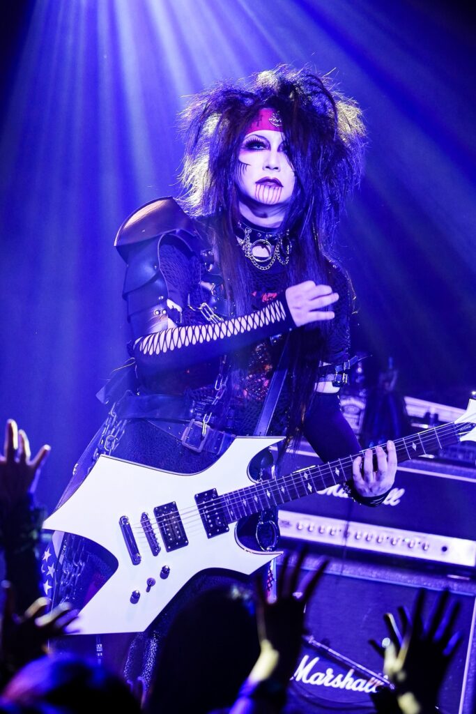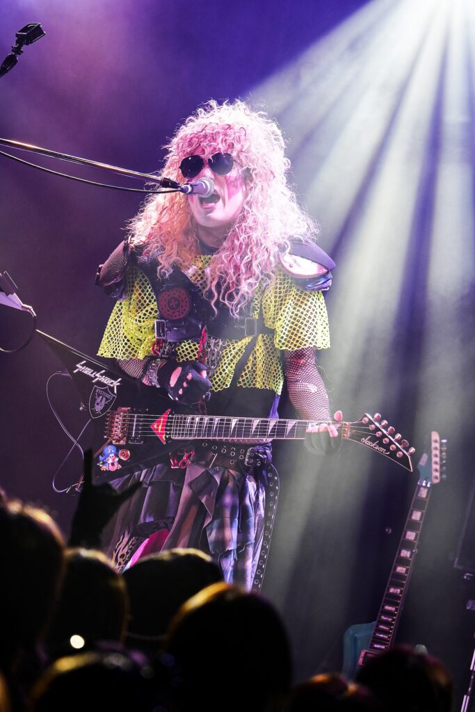 まさかのLAメタル復古大号令が、この令和の時代に実現するとは!昨年クレモンに初参加しくれた際には“ブラックメタル”をテーマにしたステージングで漆黒の夜を体現してみせたMoi dix Moisが、今年の仮装コンセプトとして掲げたのはMSTRも大好きな“80's LAメタル”。見たところMana様は使っていたワーロックのギターも含めてMÖTLEY CRÜEのNikki Sixx風、RYUXはTwisted SisterのDee Snider風、 HAYATOがMÖTLEY CRÜEのTommy Lee風を意識したスタイリングとなっていたようだが、SugiyaはStryperのイメージ、Sethは自分なりに思う概念としてのLAメタルを具現化していたらしい。