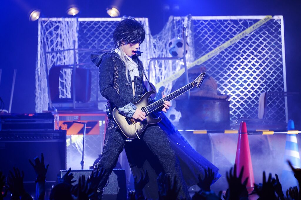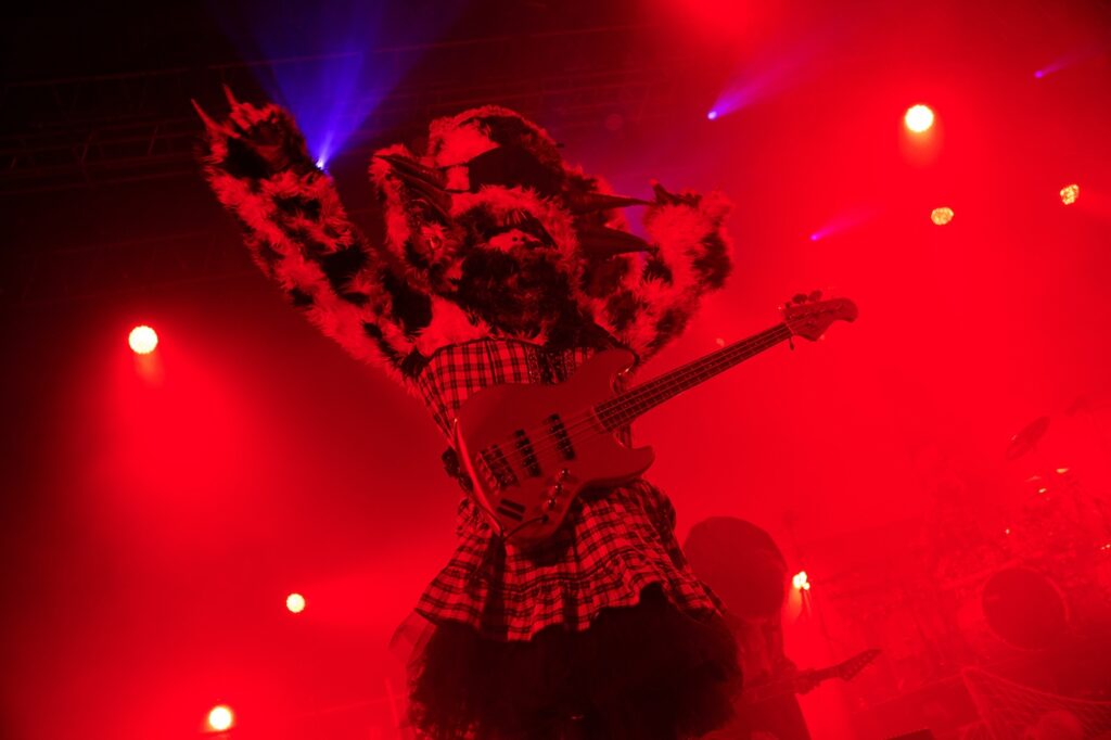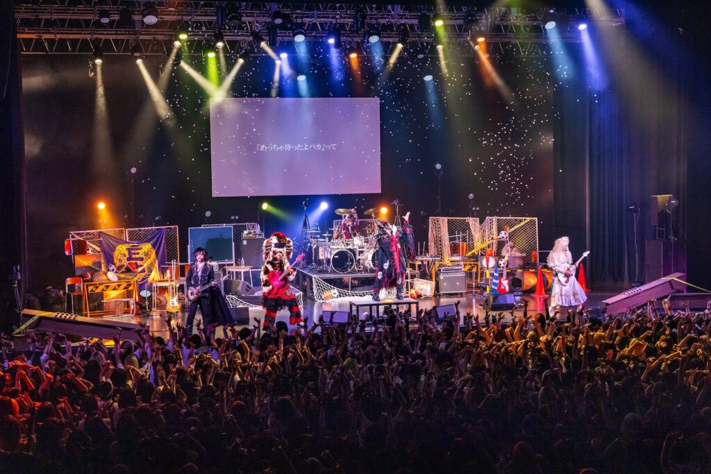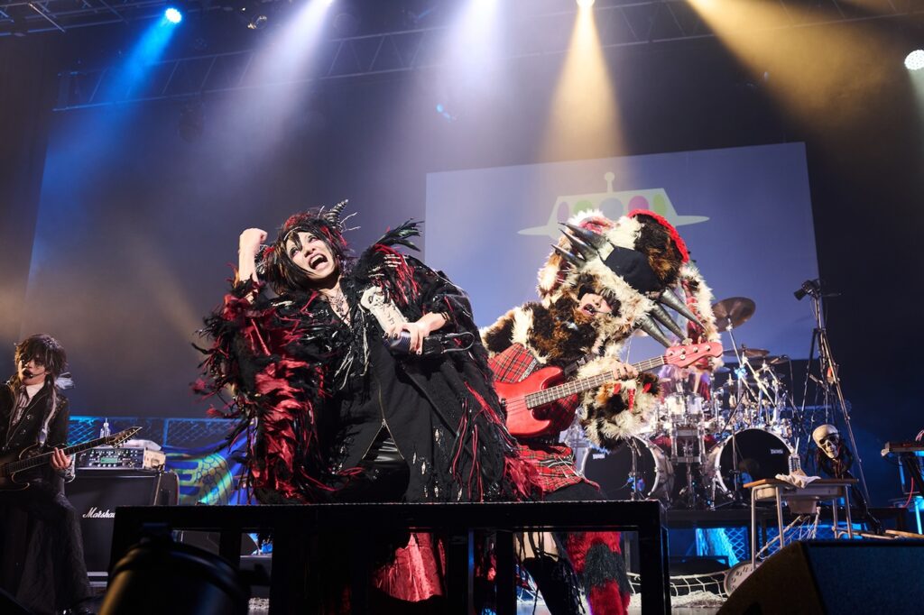 「とにかく、今日せっかく来てくれたEX THEATERにいる人を、1人残らず楽しませたい」と、目の前にいるイイコ(ファン)たちへぶうなりの言葉で感謝を伝えた。そして、「わけのわからないことばかり、へんてこな曲ばかりやってきた20年だった」と振り返ったが、一際振り切っているとも言えるお馴染みの名曲『This is a pen.』へ。20周年ともなれば、ボールペンも上空から登場する。しかも、ライヴカメラがずっと宙ぶらりんのボールペンを映し続けるという、なんともシュールな画を見せ続けられたのだが、フロアでは“This is a pen.”に合わせて手を繋いでジャンプするなど、こちらもお馴染みの様子で盛り上がりを見せた。『象男ダダ・フィフィ』では、CO2が噴き出す中でヘッドバンギングや折り畳みを交えながらも、痛快なロックサウンドの中で象のポーズで制止する様は清々しいまでに異彩を放つ。それでも、ぶうに「ずっと意味わかんない歌ばっか歌ってきた。でも、それを聴きにきたんだよね!?」と言われたら、答えは「YES」以外ない。そこへ『1999年のブルース』といった、やりきれない思いを希望へと昇華してくれるメッセージソングが、ブルージーに放たれるギャップもまたいい。