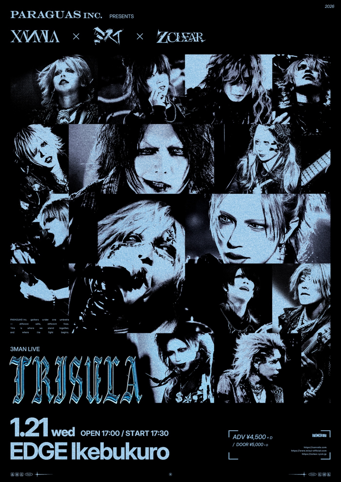 意外にも、レーベルが主催した形での全バンドの共演は、こと"PARAGUAS inc."ではこれまで行ってこなかった。各バンドが年間スケジュールを綿密に作って動いてきたことで、たまたまその機会がなかったのが理由でもあった。だからこそでもないが、3バンドの共演するイベントが決まったのは嬉しい驚きでもあった。しかも池袋EDGEという、あえてヴィジュアル系らしい箱での共演だ。XANVALAも、ミスイも、広島をベースに活動を続けてきたZ CLEAR!も、自分たちが飛躍していくうえで大切にしてきた場所の一つが池袋EDGEだ。ここをワンマン公演でしっかり埋めきったうえで、次のステージへと階段を上がっていく。もしや、今回のイベントPARAGUAS inc. PRESENTS 3MAN LIVE「TRISULA」公演を池袋EDGEで行うことにも、先を見据えての思いがあるのだろうか…。