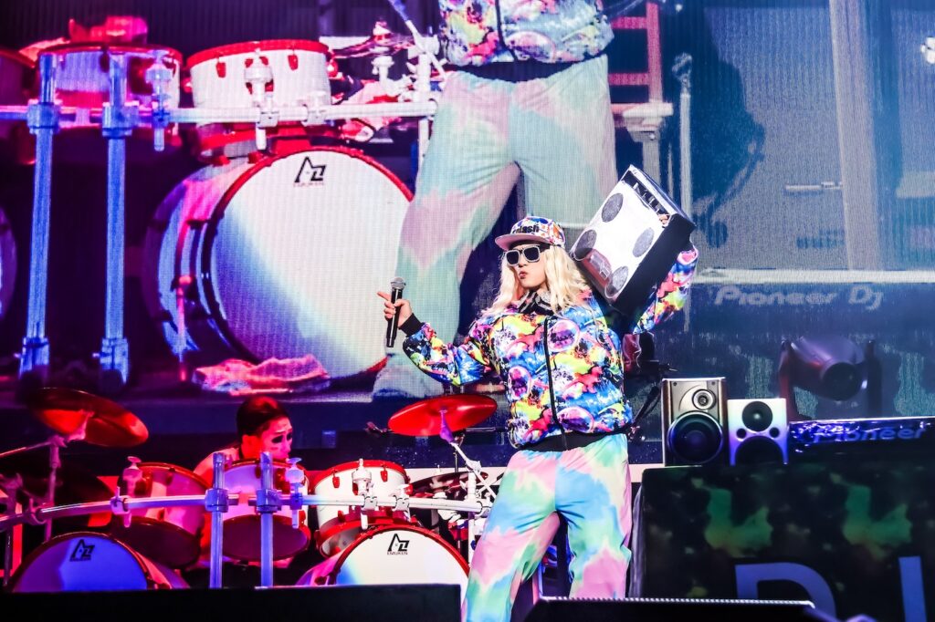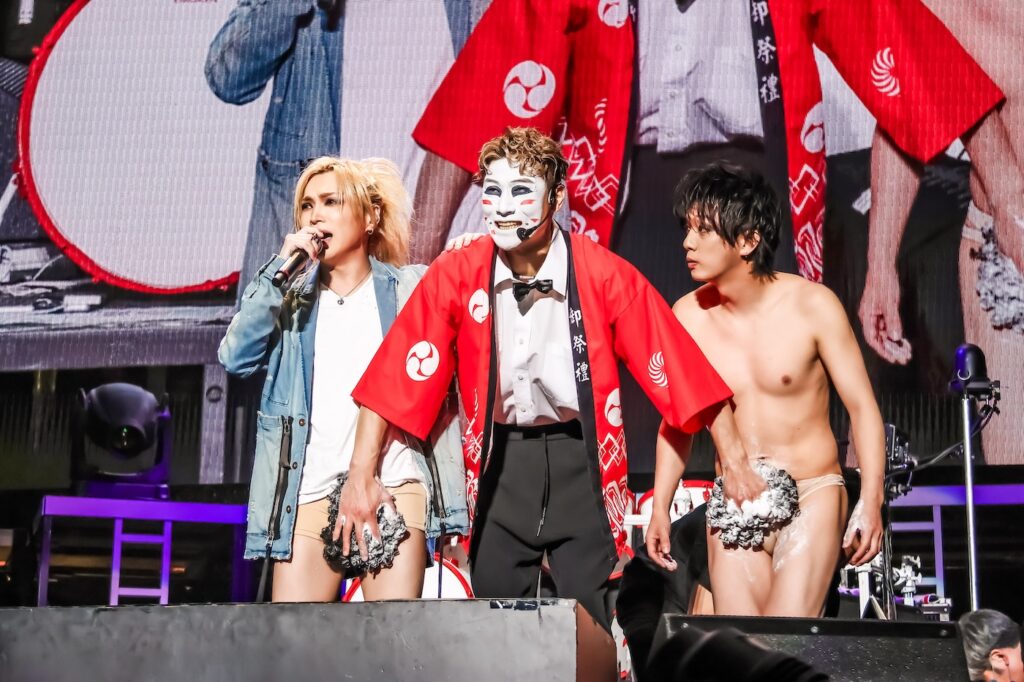 そのあとのギターソロでは、喜矢武がまさかの“下半身アフロ”姿で登場。途中、鬼龍院も“下半身アフロ”姿になり、樽美酒がアフロ部分にシャンプーまでし始めるというカオスな展開に。樽美酒は、最近パチンコ店でアルバイトを始めたという話から、ノリノリでパチンコマイクパフォーマンスを披露して、会場を沸かせた。