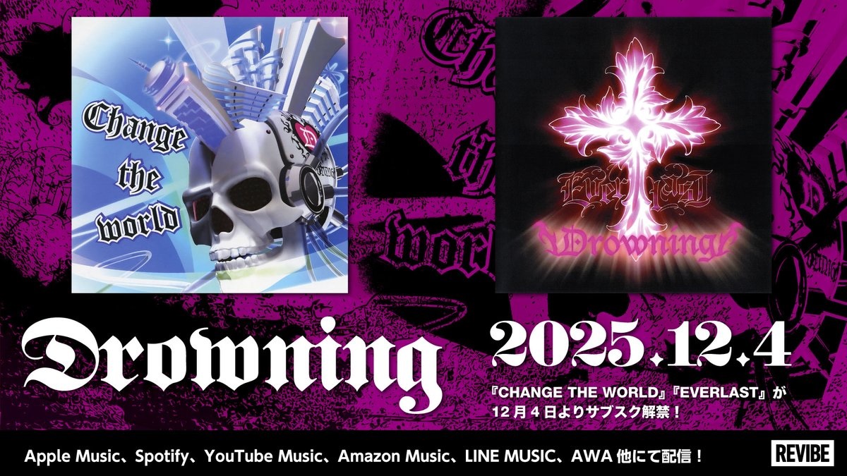 残念ながらDROWNINGは解散しており、また一部のフリマアプリでは高値での取引されているという事実、CDを手に入れるのも難しい状態を鑑み、YU+KIを中心に当時のメンバーと話し合い、国内だけではなく海外の人に聴いてもらいたいという結論に至った結果、急遽ではあるが過去の音源から2タイトルをサブスク解禁となった。