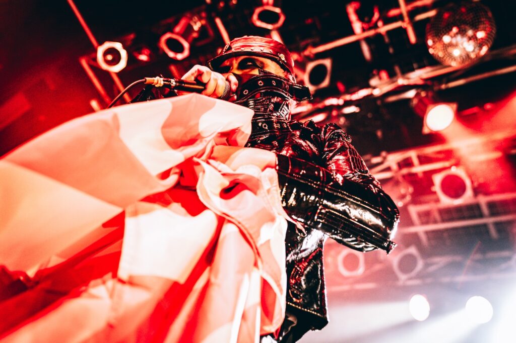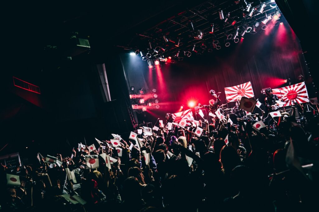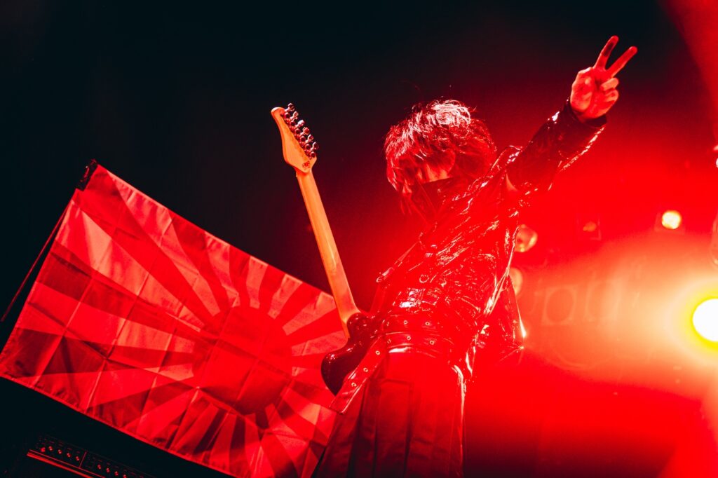 ステージ上には日章旗が掲げられ、入口でゲリラ的に配布した国旗を振るオーディエンスと織りなす時間はある種異様だ。