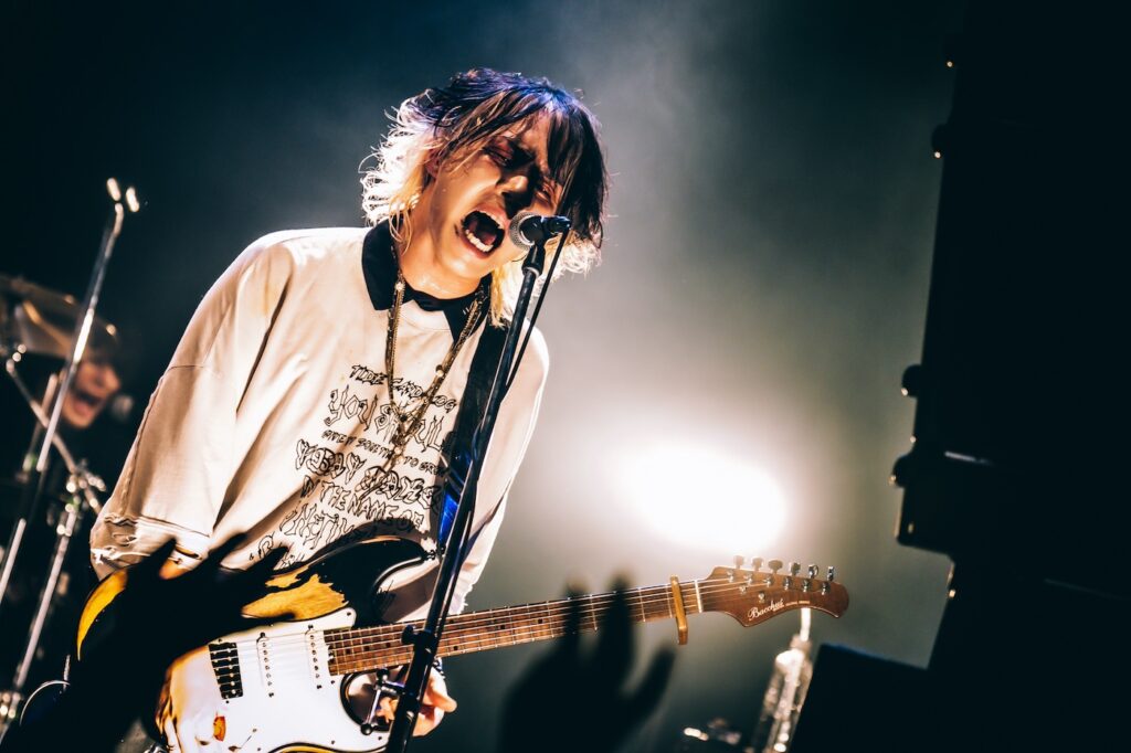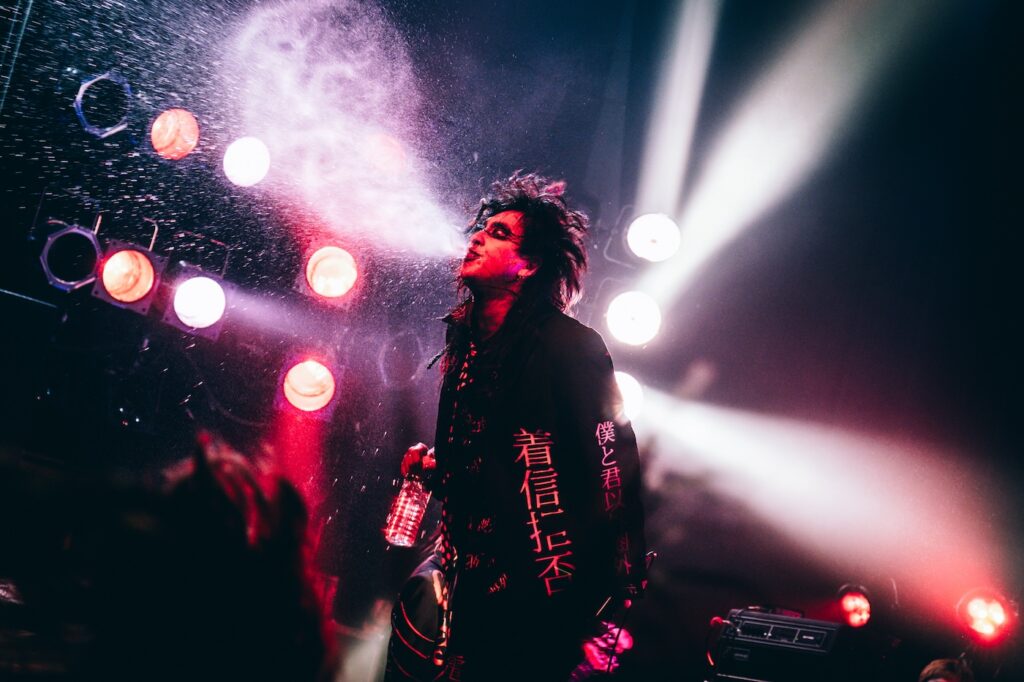 「指名手配が指名手配」から始まったステージで、伐(Vo)は終始「バカ!死ね!殺すぞ!」と荒々しく煽り倒し、観客にも徹底攻撃で容赦なく水を吹きかけ続ける。いつものまみれたと言えばそれまでだが、ここまでのセンチメンタルな空気を排除するように主義主張をぶつける様は彼らなりの誠意だ。