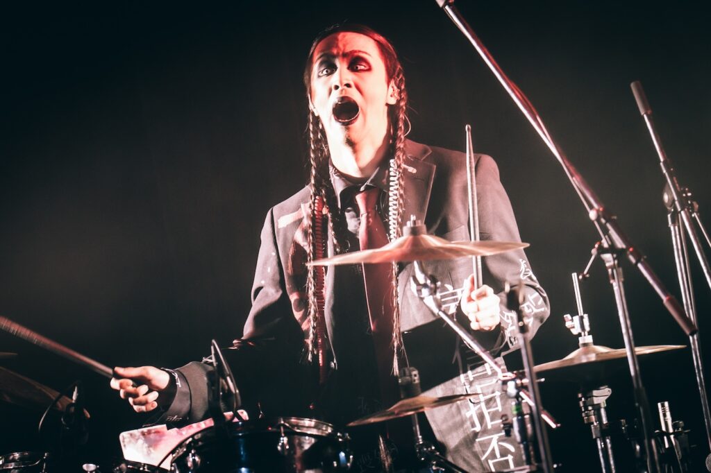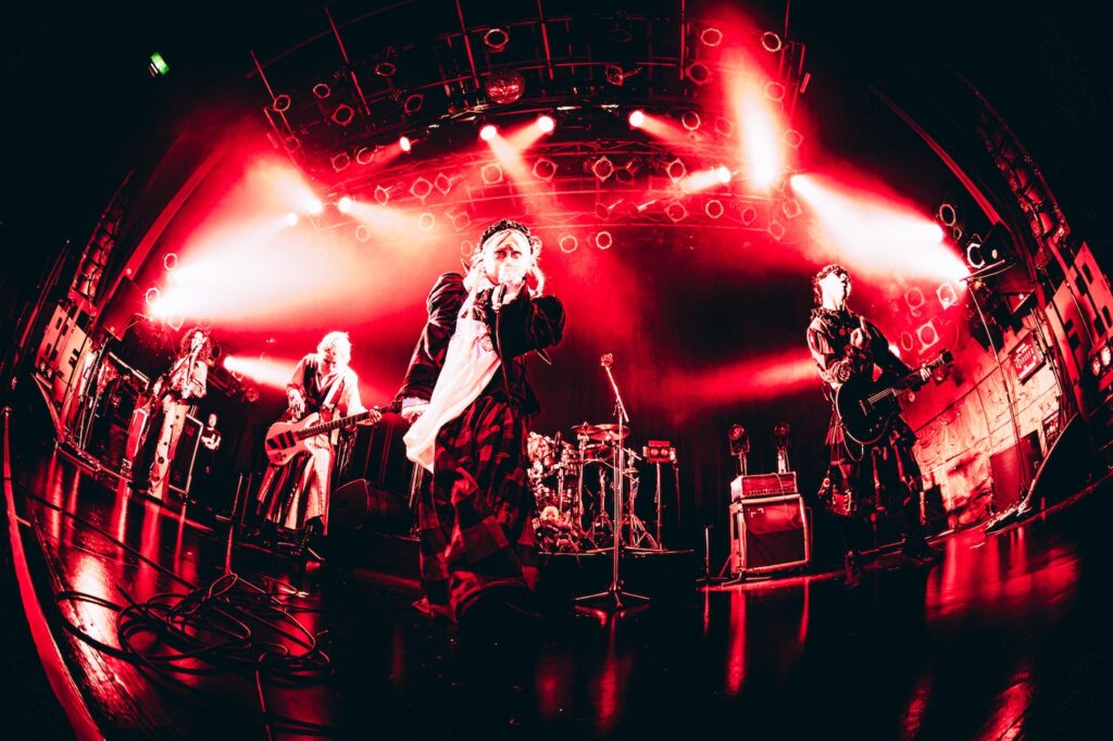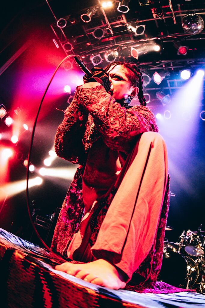 「九州福岡より我々、漢気を持って参りました!」と不破(Vo)が告げて始まった「チヨコレヰト パレヱド」以降は、哀愁のある旋律が直情的な荒々しさとともに襲い来る「ワラベウタ」、マーチングドラムと「万歳!」の咆哮が響き渡る「零」と強烈なメッセージ性の楽曲が並んだ。