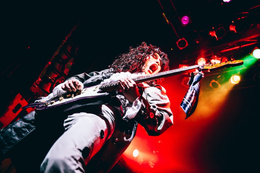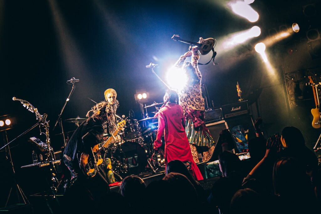 終盤に入ると4人のメンバーは持ち前の規格外の華やかさと暑苦しさで全身全霊のエナジーで襲い掛かってくると、ANNIE Aが会場バーカウンターに雪崩込んだ「未知への旅路」まで容赦ないステージで圧倒した。