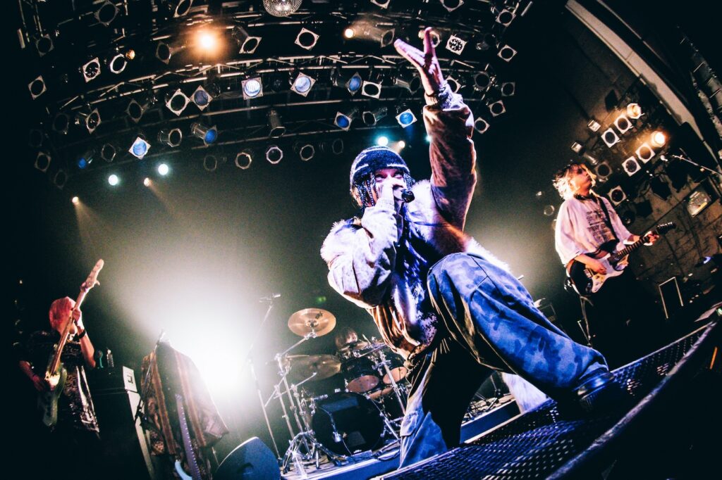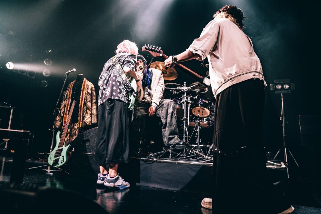 TikTokで1億再生を記録した……という枕詞がノイズになるほど鋭利な「もしもし」、キラーチューン「お邪魔します」で会場を狂乱の渦に落とし込むと、最後の「隣の席の卑猥ちゃん」まで終始常軌を逸したテンションで彼らが標榜する“床下”の如く暴走モードで駆け抜けた。