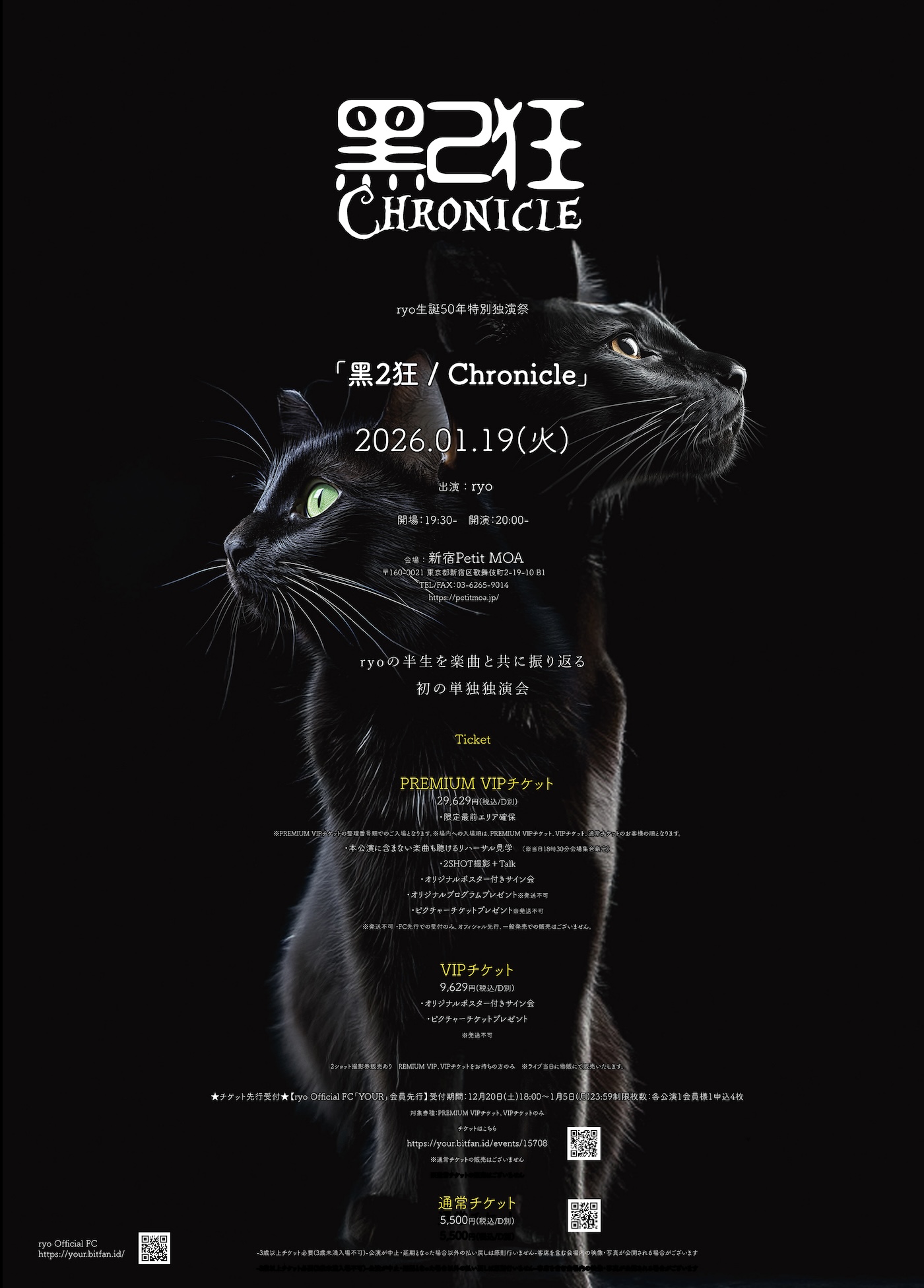 【ryo】<ryo生誕50年特別独演祭「黑2狂 / Chronicle」>開催決定!