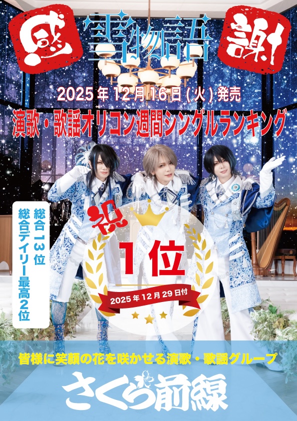 3. 【さくら前線】V2達成の大快挙!NEW SINGLE「雪物語」オリコン演歌・歌謡チャート堂々1位獲得!