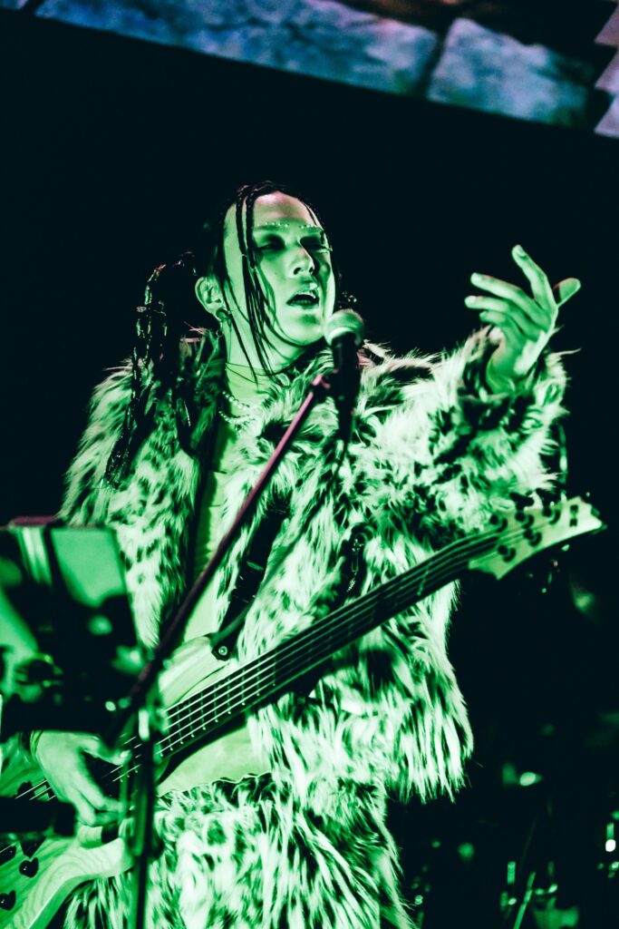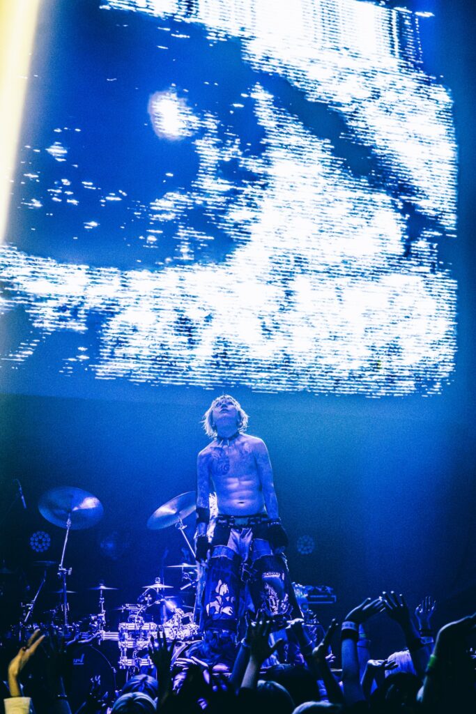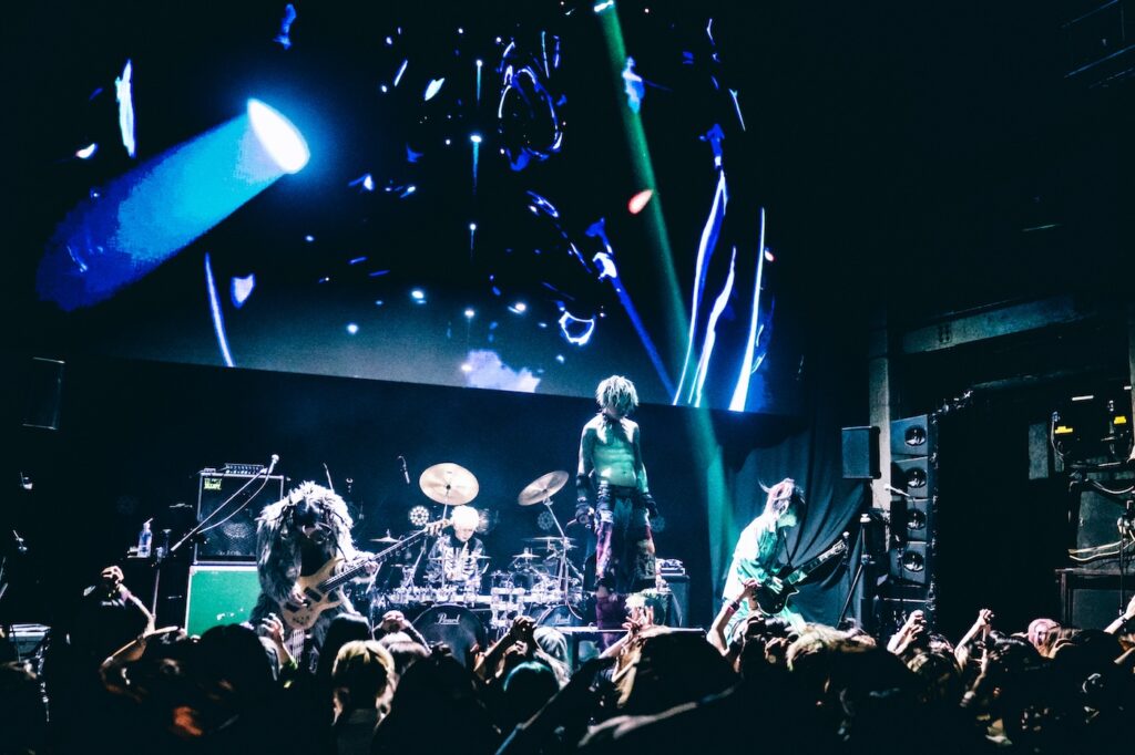 その“愛おしさ”の背景にあったのは、“初期衝動”とも等しい音楽を通じて感じられる喜び。音楽もバンドもすべてが「楽しい!」と涼太が無邪気に語り、『TOXIRUSH』を皮切りに突入したのは激情の応酬ゾーン。ここで特筆すべきは、最新アルバムのリード曲である『VOID』がしっかりとピークを作り上げ、最新を武器にできるTHE MADNAの凄味を感じられたことだった。ラウドな楽曲でひときわ映える太嘉志のギタープレイの傍ら、常にタイトな理緒(Dr)が熱を帯びた強打を響かせていたのも印象的だった『VOID』を経て、単なるダイナミックさゆえのインパクト勝負だけではなく、4年間のうちに表現の幅を広げてきた賜物といった具合に、ゴシックな世界観に観客を飲み込んでいった『激白』。朋(Ba)は激情を露わにし、太嘉志は歪んだギターで彩りを与え、涼太は憑依したように歌い上げるといった表現力も、“波”のある巧みな展開を引き立てていた。さらに『HYSTERICAL』では、涼太が血(糊)で顔面を染め、一層刺激的な香りを強めながら“アブノーマル”を強烈に印象付けていく。「ブッ飛びてーんだろ!? 狂いてーんだろ!?」と扇動して突入した『OUTLAW』では逆ダイブセクションをループ。ヒリヒリとしたスリルと狂気を多彩に魅せ、極めつけに『サディスティック・トルパネーション』で爆発的な狂騒ぶりを発揮し、THE MADNAのエネルギーの根源である“偽りの世界で生きるがゆえの自己肯定感”をまざまざと見せつけると、まさしく瞬間の美学と言わんばかりに演奏が鳴りやむ前にメンバーはステージを後にしたのだった。
