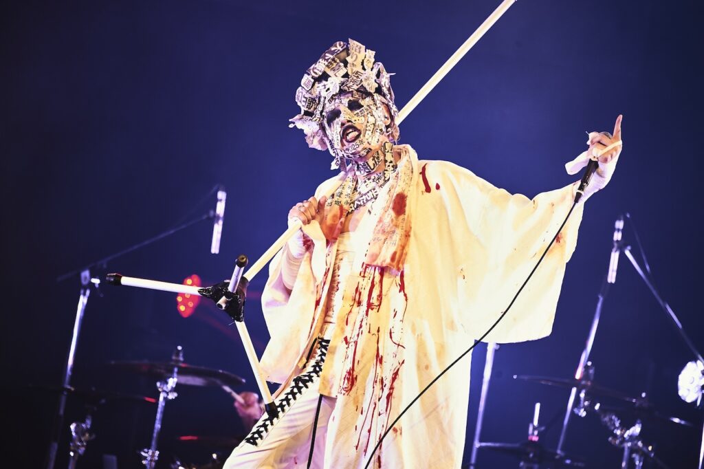 そのシンボル的存在が、猟牙(Vo)である。経文が書かれた袈裟のようなものを垂らした白装束に身を包み、顔には怪文書さながらの文言が無数に貼り巡らされ、傘をさして登場した猟牙。その出で立ちは、曲頭にお経が鳴る『HUMAN ANALOGY』と抜群にリンクし、力任せに木魚を打ち鳴らしながら歌う猟牙と、各々強烈なキャラクターを放つバンドの狂気には、思わず感嘆の息が漏れるほどだ。