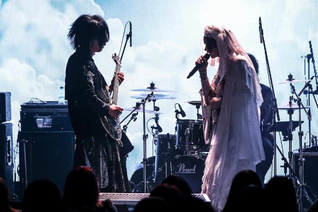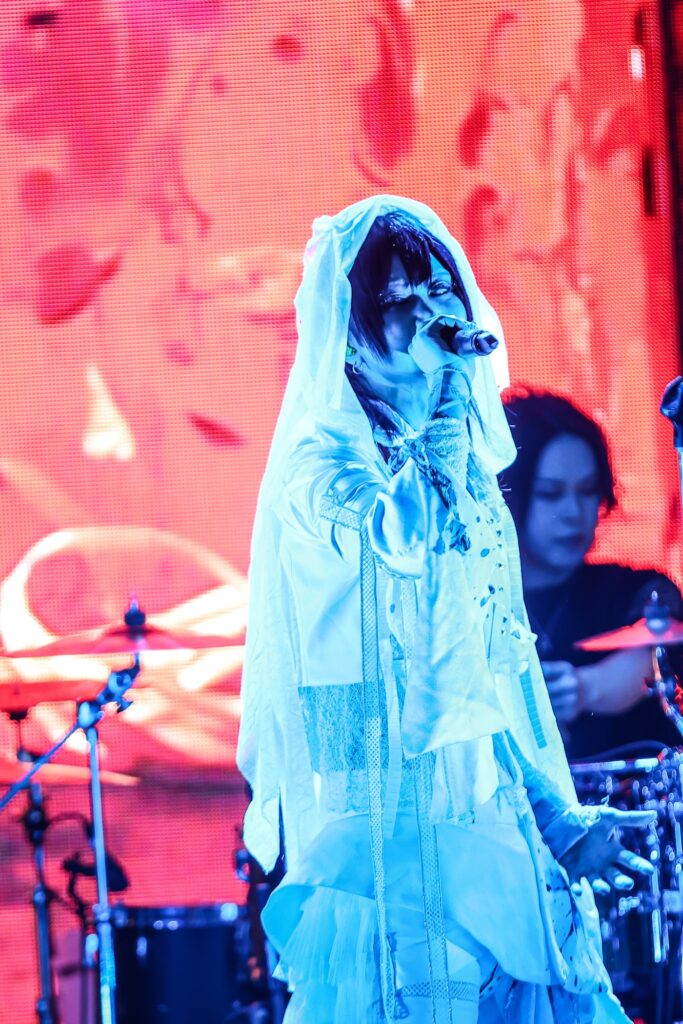 血塗れの白いウェディングベールのような衣装を纏った六(Vo)の“はじめようか東京!”と共に始まったのは「C4NDY」。後方の映像も幾何学的なものに切り替わると、会場の一体感もグッと高まる。