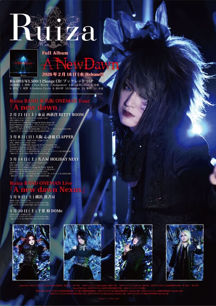 Ruizaは、アルバム『A New Dawn』を手に、2月21日よりRuiza BAND東名阪ONEMAN Tour「A New dawn」を行う。