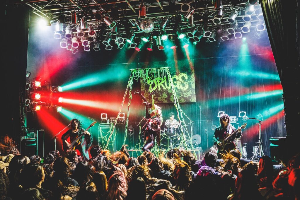 毒々しさのあるステージには、ギラギラと光を放つミラーボールが少しばかりミスマッチで、しかしその情景はDRUGSに宿る不器用ながらも生きようとする灯火を彩っているようでもあった。