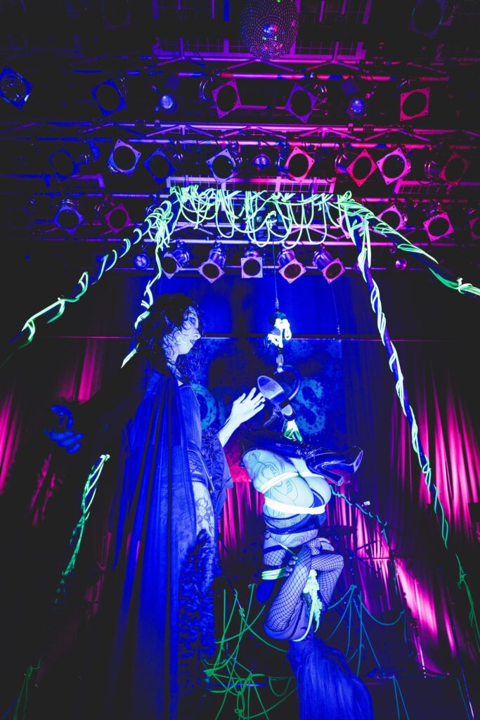 待ちに待った開演の時を迎え、徐々に幕が開くと共に露わになったステージには蛍光色のロープが張り巡らされており、センターに鎮座する絞首台を彷彿とさせる吊掛台がひと際目を引く。