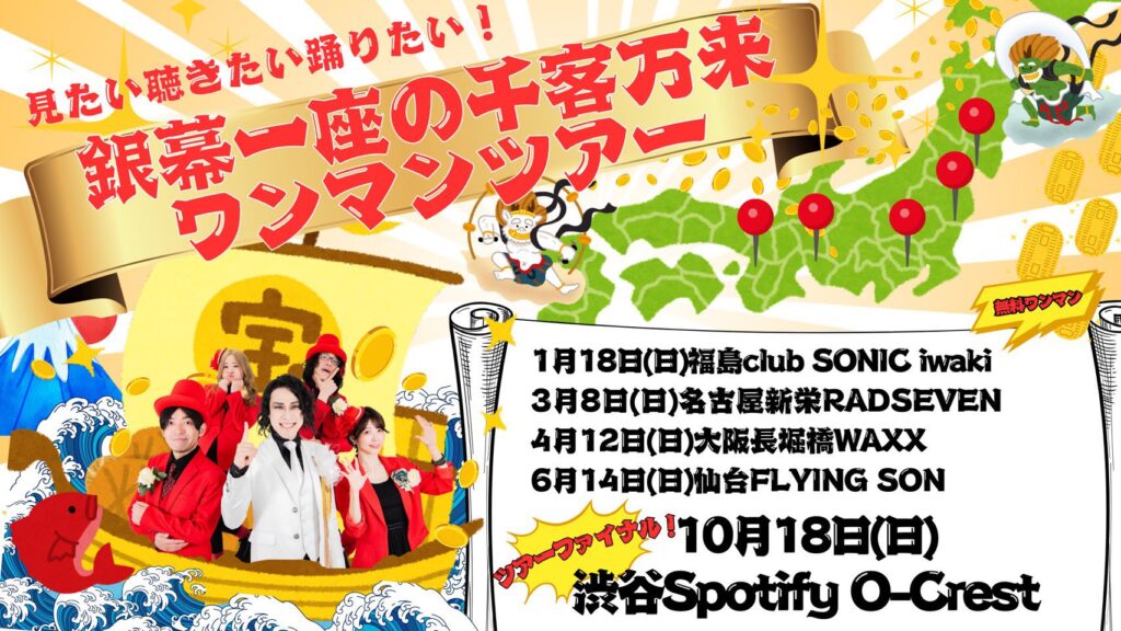そんなバンドは今年全5本に渡るツアー、その名も「見たい聴きたい踊りたい!銀幕一座の千客万来ワンマンツアー」を敢行中だ。1月に彼らにとっても思い入れのある福島・club SONIC iwakiから始まったツアーは、3月8日(日)に名古屋、4月12日(日)大阪、6月14日(日)宮城、10月18日(日)東京と全4本を残している。