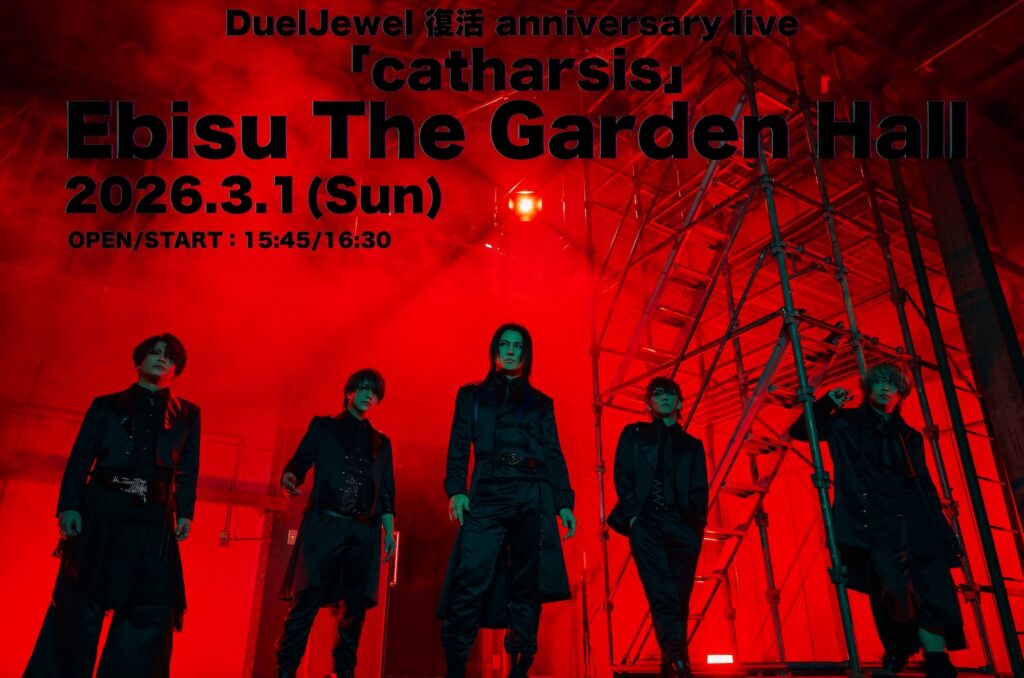 <DuelJewel復活 anniversary live「catharsis」>は復活7周年の節目に開催される記念公演。3⽉1⽇(⽇)恵⽐寿The Garden Hallにて開催、チケットは現在販売中だ。