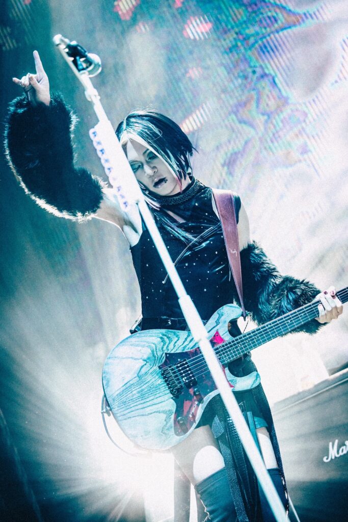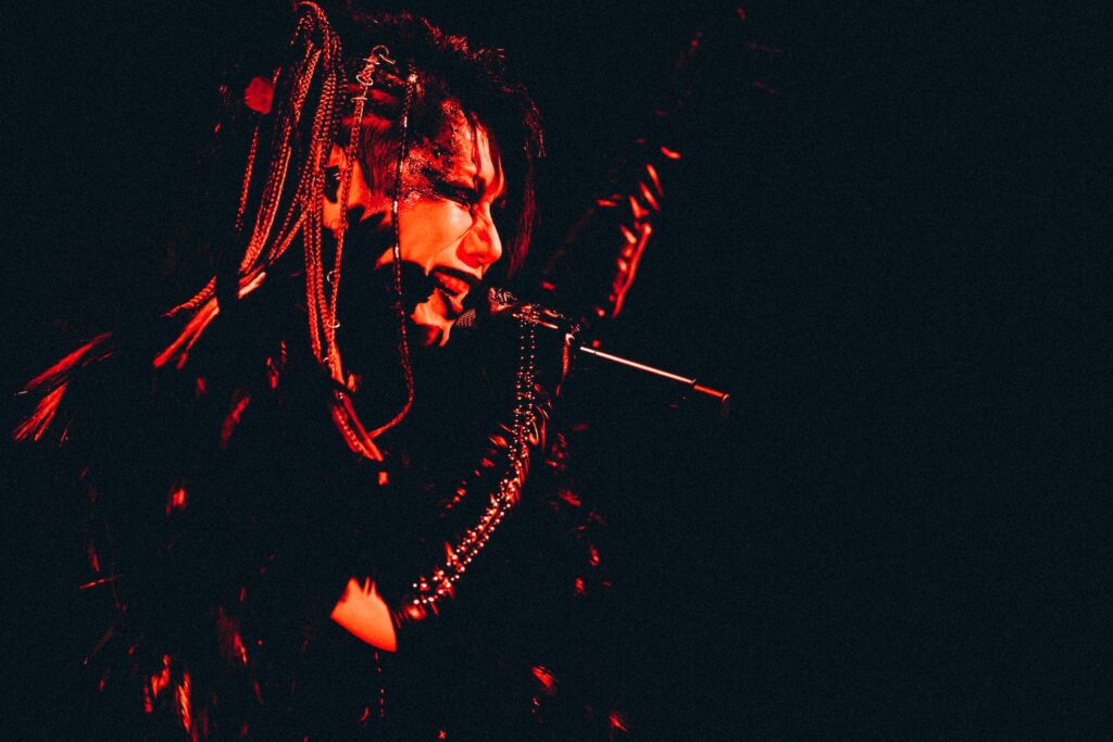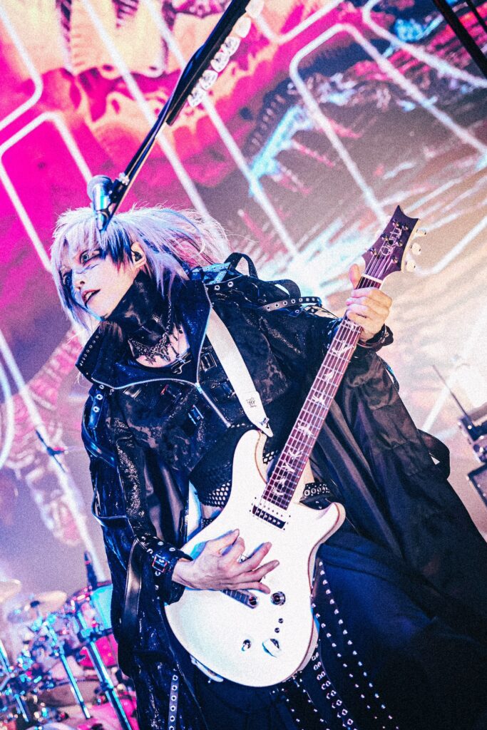 真緒の挨拶に続いたのは、『Rosario-ロザリオ-』。強靭なギターリフと荘厳さが交錯する音像に続き、『Payment of vomiter』では禍々しい重みが一層増していく。『斑-まだら-』では高音ボイスが悲壮感を煽りながらも激しいヘッドバンギングが巻き起こり、感情の混沌を生み出した。さらに、『嘆きの幸福』では映像演出(この日の映像はすべて美月によるもの)が楽曲の世界観を引き立てシネマチックな表現へと深みを増し、景のダイナミックに魅せるドラムプレイが情感をより立体的に描き出していた。