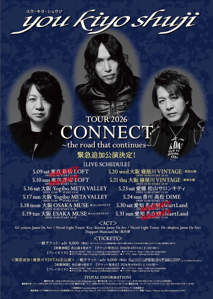 元Janne Da Arcのメンバー・you(Gt)、kiyo(Key) 、shuji(Dr)の3名が揃ってSNSを更新し、2026年5月9日(土)東京・新宿LOFTを皮切りに、全国5都市・全10公演を行う【you kiyo shuji TOUR 2026 CONNECT〜the road that continues〜】の追加公演を、大阪・寝屋川VINTAGEにて2日間行うと発表した。