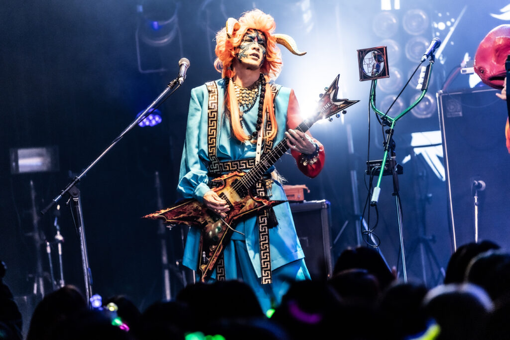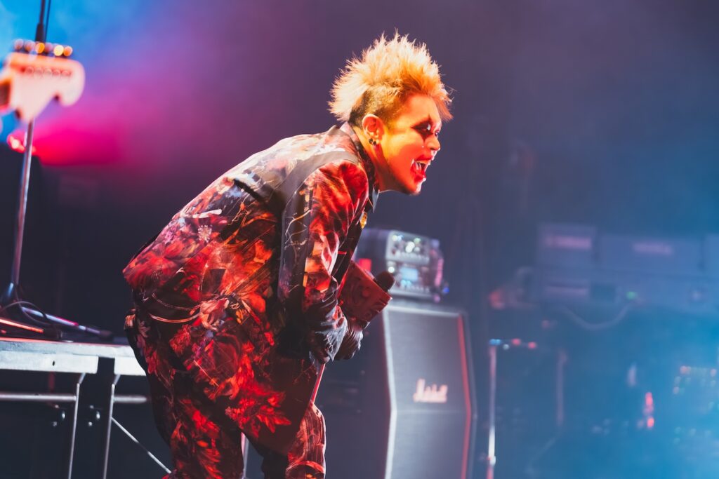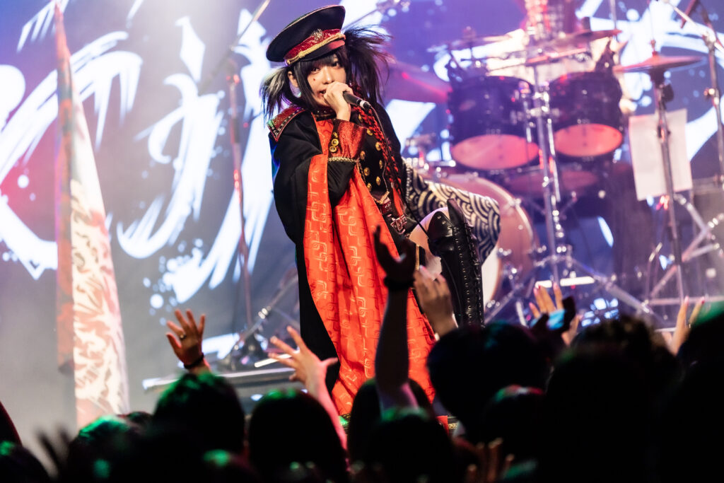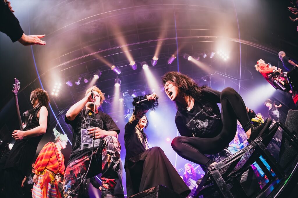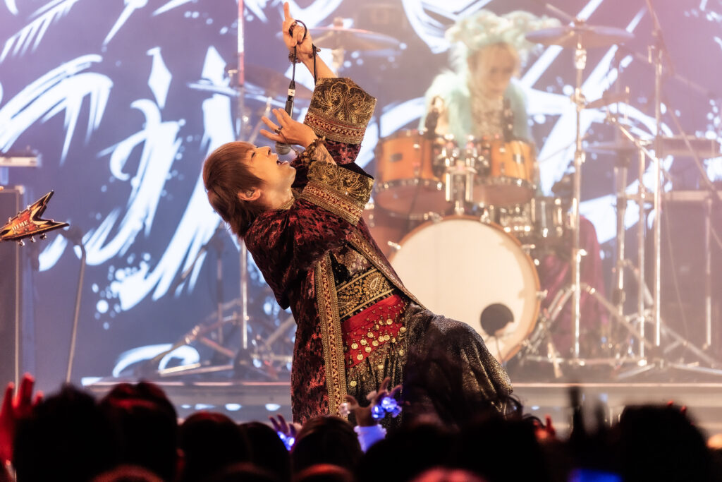 ここからライブは、一気に激しさを増していく。荒ぶるseekの煽り声を合図に飛びだした『Murderer・Death・Kill』に乗せて、観客たちが一斉に騒ぎだした。YURAサマの叩き出す軽快なビートが熱狂へと導く軸になり、そのうえでDAISHIと楽器陣が感情を露に、ときに激しく頭を振りながら音を繰り出していた。曲が進むにつれて、楽曲の表情が豊かさを増していく。