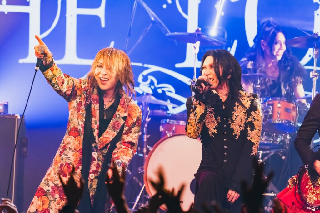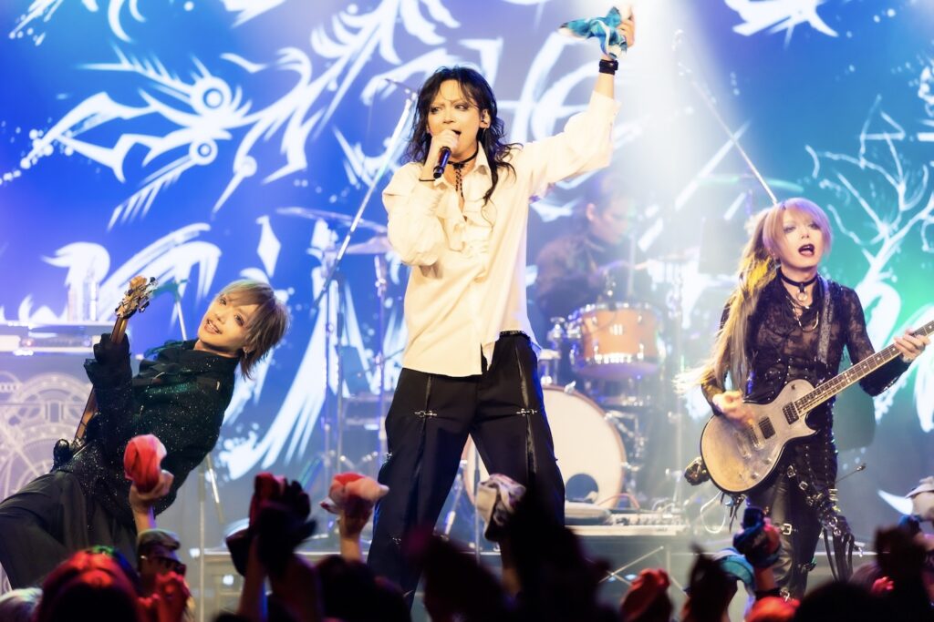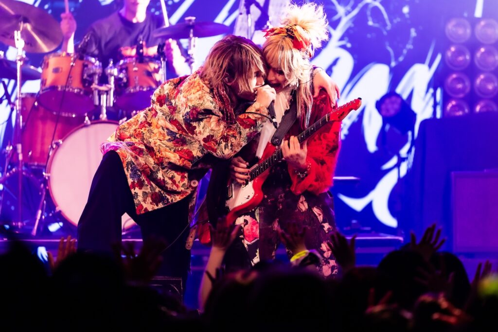 次に届けたのが、MIRAGEの『…Air』。悲哀に満ちた艶やかな苑の歌声が、胸をキュッと締めつける。そのうえで、唸りを上げて演奏が勢いよく駆けだした。巧みに緩急のドラマを描きながら、楽曲は感情を豊かに突き進む。KISAKIの音楽人生の歩みを振り返るように進んでいく演目も、この日だからこそ味わえた嬉しい要素。かつての名曲たちを、THE LOCUSを通して描きだすことで、どの楽曲も艶やかさや華やかさを増した姿で目の前に映しだされていた。間奏では、HIZAKIがギターソロを奏でる姿へ、KISAKIがさりげなく寄り添う姿も見せていく。激しさと嘆きの表情を巧みに交錯しながら、その演奏は、身体を揺らし、手の花を咲かせ、触れた人たちの心を濡らしていた。それにしても、苑の艶めいた歌声は本当にいろんな色で感情を揺さぶってくれる。
