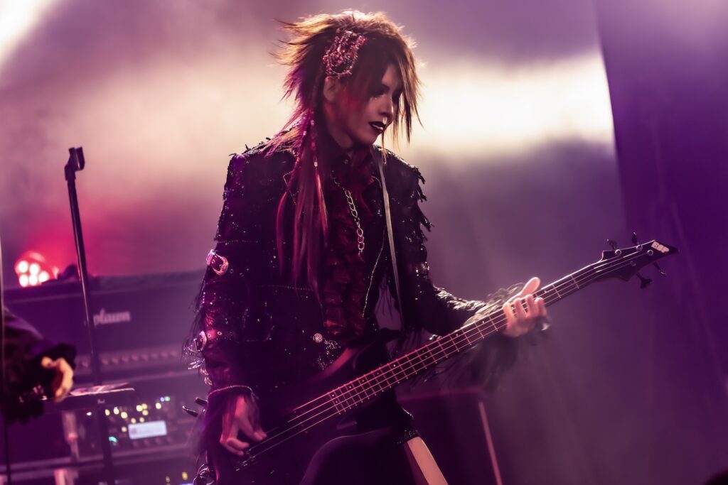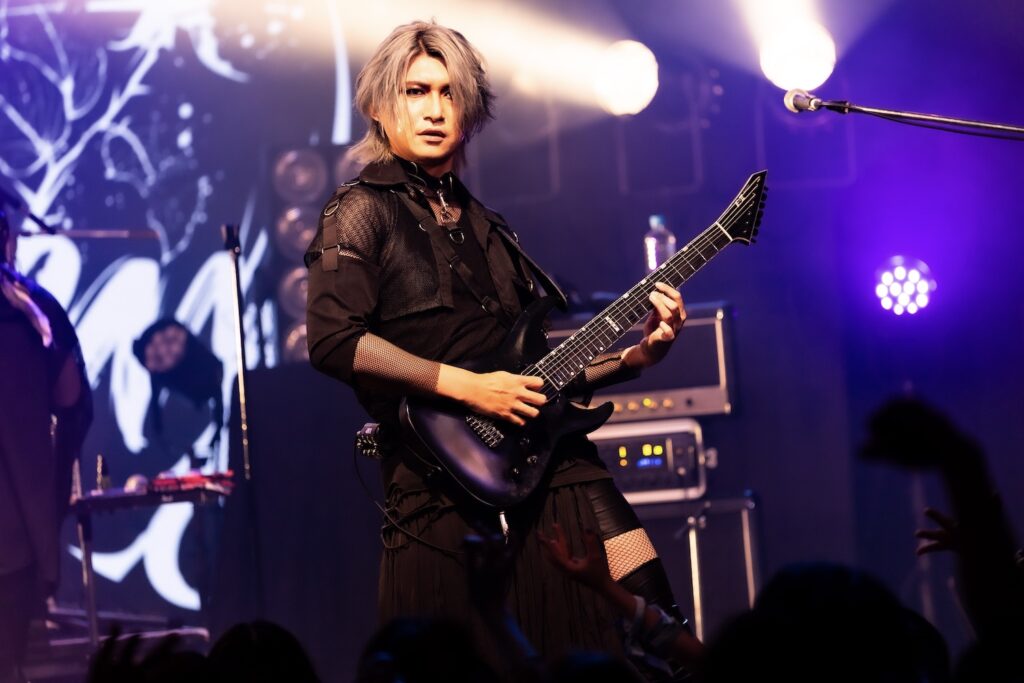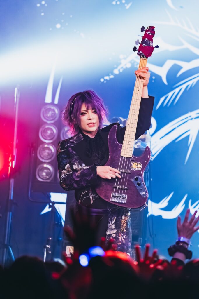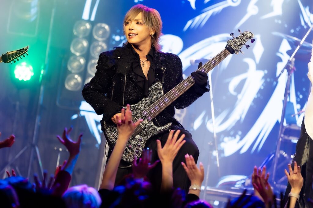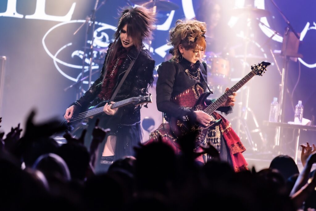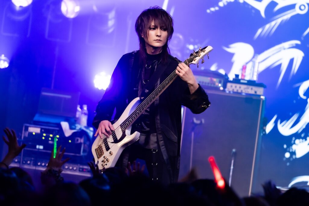 「暗黒に染まりなさい」の声を合図に、無数のCO2が天高く吹き上がる。そのうえで奏でたのが、Phantasmagoriaの『Unknow zero distance』だ。冷静に音を繰り出しながらも、剥きだした攻撃的な姿で攻めるKISAKI。HIZAKIが麗美な姿で華やかな旋律を繰り出せば、そこへ苑が刺々しい色を歌声で描き加えていた。細かい指の動きを示しながら、重厚な音の弾丸を次々と繰り出すKISAKI。いつだってそう、彼はバンドの音の土台を支えながらも、しっかりと主張する演奏で、他のメンバーの気持ちを煽り、鼓舞していく。左右に動きながら演奏をするKISAKIの姿に刺激を受け、他のメンバーたちも気持ちを前のめりに、次々と音を解き放っていた。