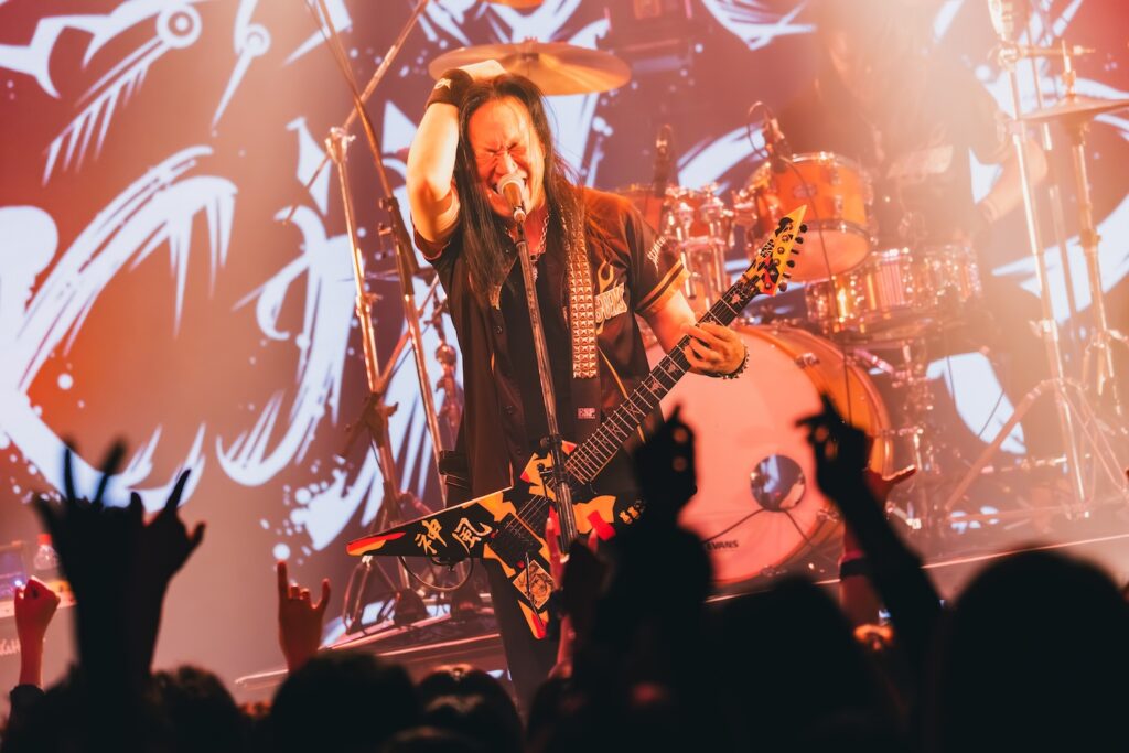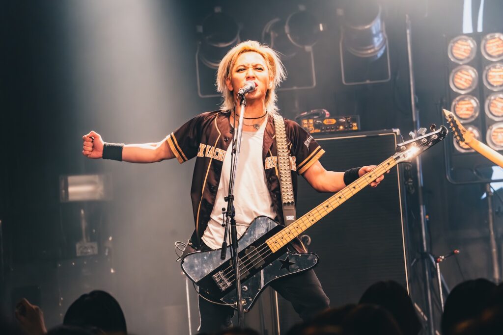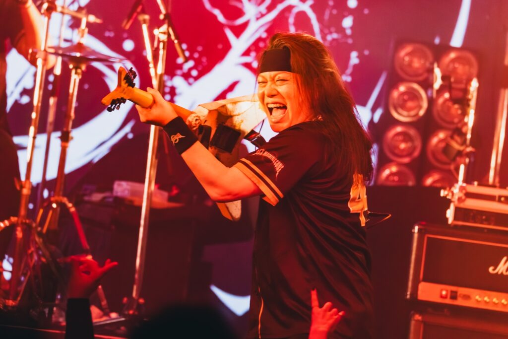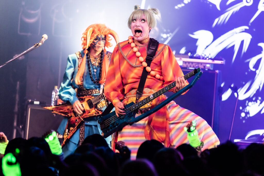 続く『ファミレスボンバー』でも刺々しいリフを次々と高速で叩きつけ、SEX MACHINEGUNSは観客たちの理性をどんどん消し去っていく。攻撃的な演奏の上で、雄々しい声で歌いあげるANCHANG。そのコントラストも彼ららしい。フロアでは、思いきりヘドバンに興じる人たちや拳を高く上げる人たちまで、本能に突き動かされるままに暴れ騒ぐ景色が広がっていた。途中、少しだけ速度を緩め、フロント陣の3人がステップを合わせる面も登場。巧みに緩急のドラマを描きながら、演奏のみならず、さりげない振りを通してもSEX MACHINEGUNSは、一糸乱れぬコンビネーションを見せていた。
