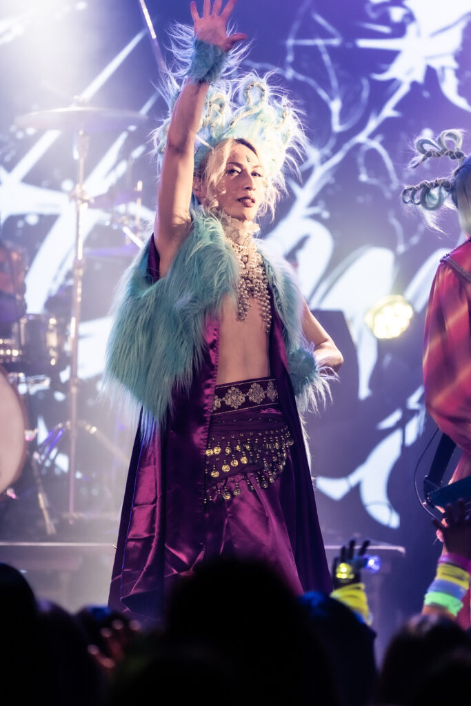 神(KISAKI)への祝いの言葉を述べた後、最後に椎名ひかりはアッパーでダーク&ラウドな『バババーババウムクーヘン★』を叩きつけ、この場を左右に手が揺れる景色に染めあげた。途中、身体を激しく折り畳みグロウルすれば、フロアでも同じ動きが生まれるなど、椎名ひかりは、一体化した景色をこの場にしっかりと作りあげていった。ヴィジュアル系らしいノリ方のツボを抑えた楽曲ばかりなところも、椎名ひかりのライブの嬉しい魅力だ。ほんと「アリガタキ!!」ライブだった。