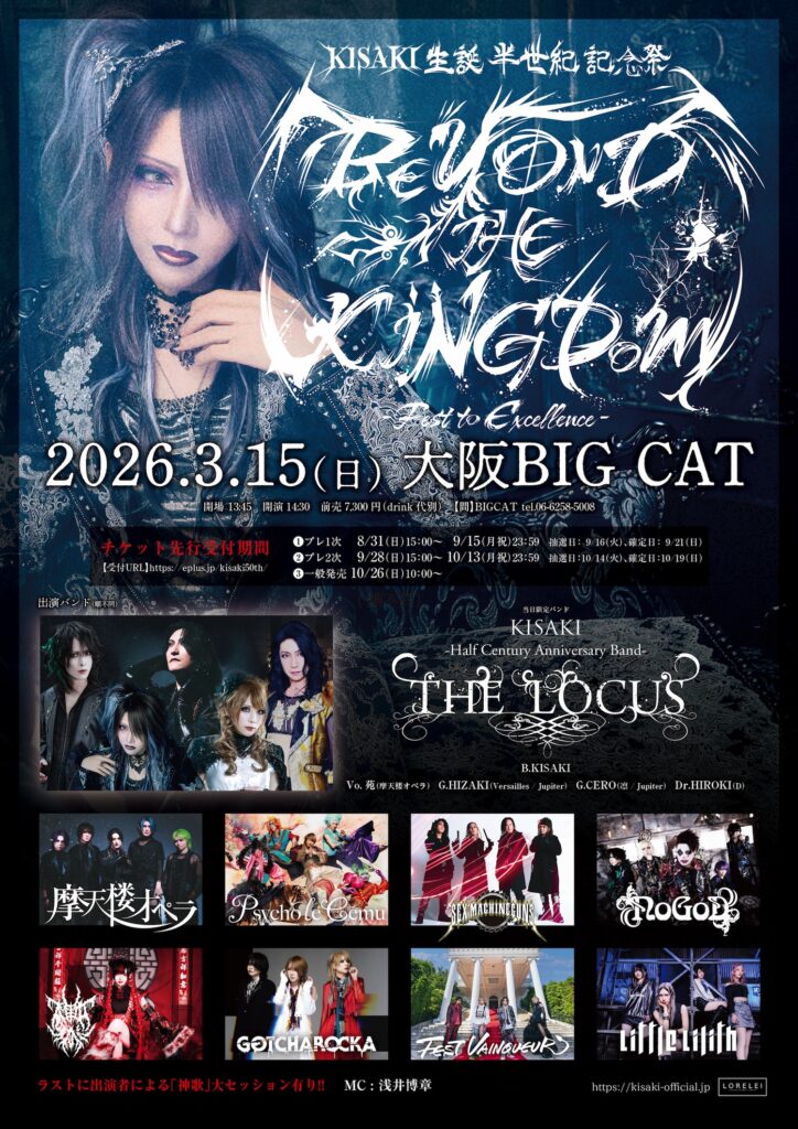 【KISAKI】ライヴレポート<KISAKI 生誕半世紀記念祭「BEYOND THE KINGDOM -Fest of Excellence-」>2026年3月15日(日)大阪心斎橋BIGCAT◆KISAKI生誕半世紀記念祭、圧倒的熱狂の中、堂々終幕!!KISAKIの半世紀が、仲間たちとともに音の方舟に乗せて蘇った一夜。