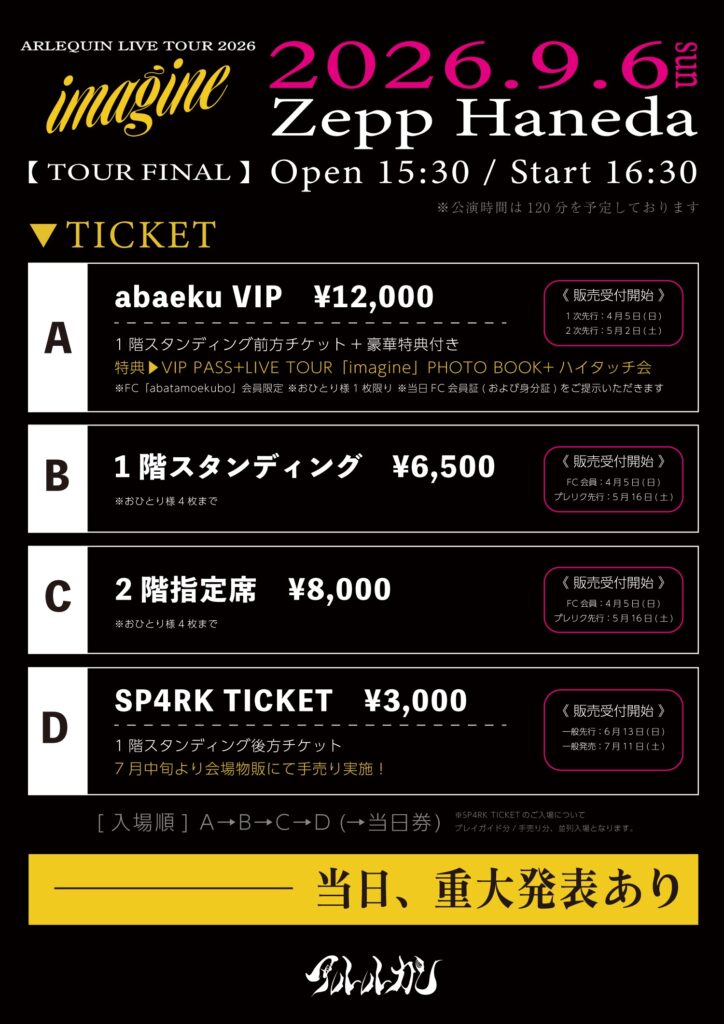 アルルカンが9月6日に東京・Zepp Hanedaで開催する「LIVE TOUR 2026『imagine』」ツアーファイナルのチケット情報を公開。あわせて、ファンクラブ会員を対象とした1次先行受付がスタートした。