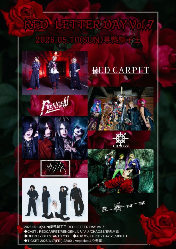 REDCARPET、RENGEKI、カリソメ、CHAOSS、賽の河原の5バンドが集結する。