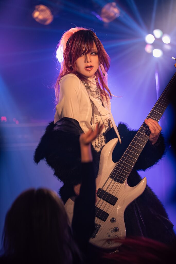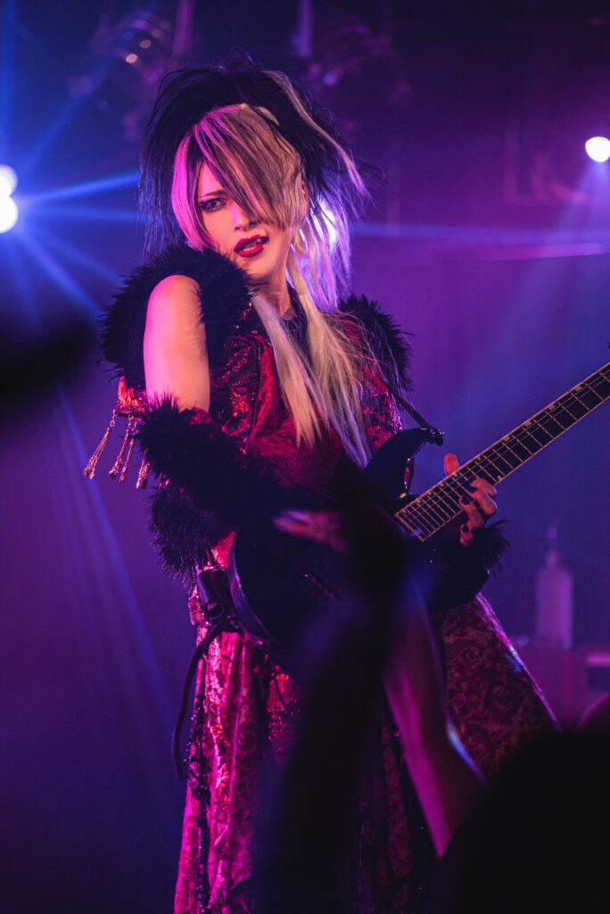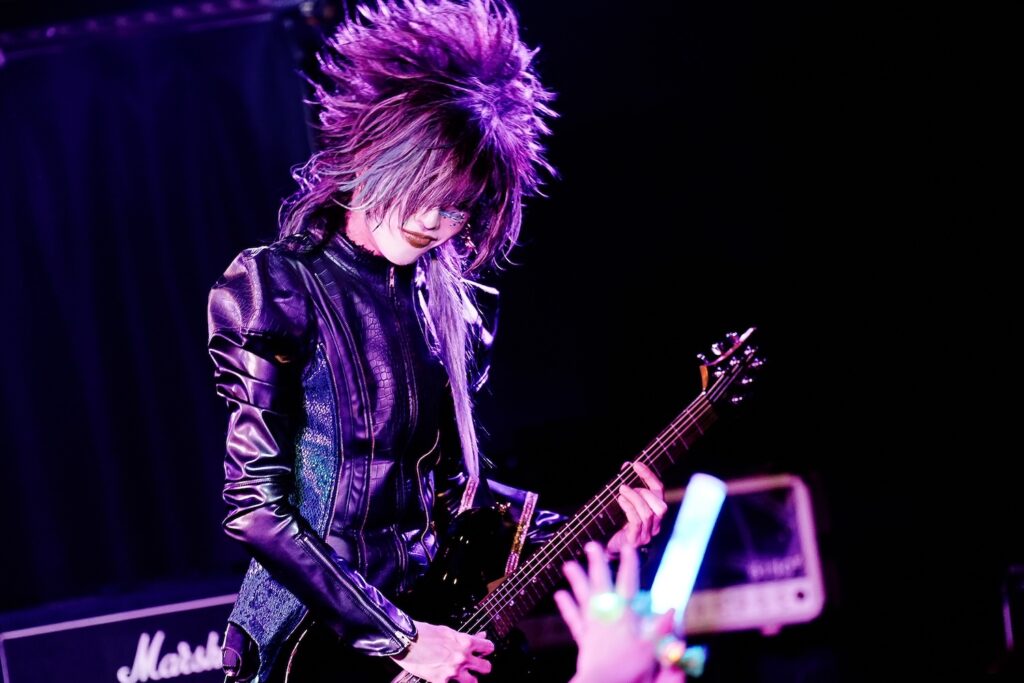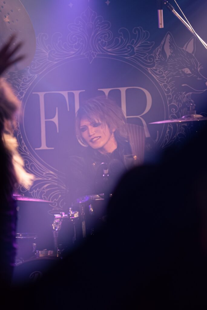 フロアに流れていたBGMが止まり、照明が消えた。フロアからはメンバーを呼ぶ声が轟いた。SEが鳴ると、まずはCion(ボーカル)以外のメンバーが登場、満を辞してCionも登場し、フロアの期待感がいやでも高まっていく。その中で落とされたのは「DROP」。空気がFUR色に染まっていた。紫やピンクの妖艶な雰囲気がピッタリである。場の空気を牛耳るかのようなCion、巧みな技術を見せつけていくRYU(ギター)、アグレッシブに楽曲を奏でるLIE(ギター)、楽曲を底から支えるViVi(ベース)、パワフルに1打に思いをこめるREIYA(ドラム)。それぞれの個性が早くも爆発していた。