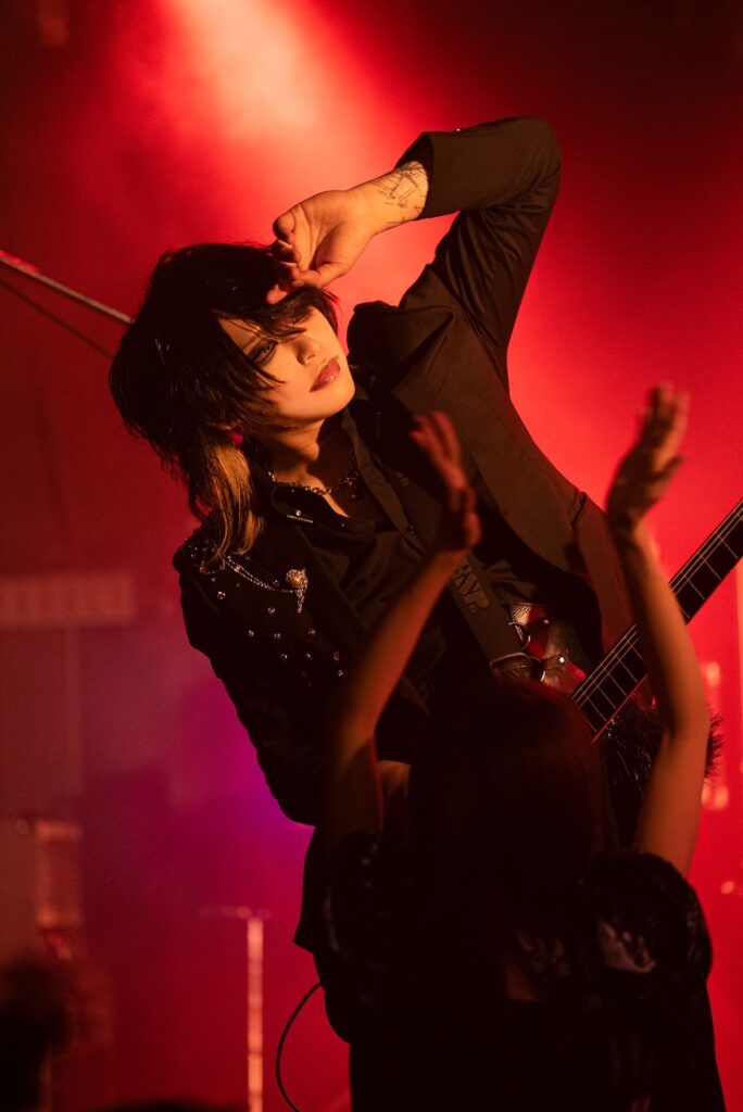 「愛情low bot」では再び「声出せ」とフロアに命令をするnao。男らしい叫びに、フロアも応える。重々しい音が体全体に染み込むが、歌いながらギターをつまびくkosukeに、楽曲のメロの美しさを感じとれた。落ちサビでは、naoにピンスポットが当たる演出がなんとも憎い。「声出せ」と煽りながらも、1番、心を露わに叫んでいるのはnaoなのではないか、と感じさせられる。