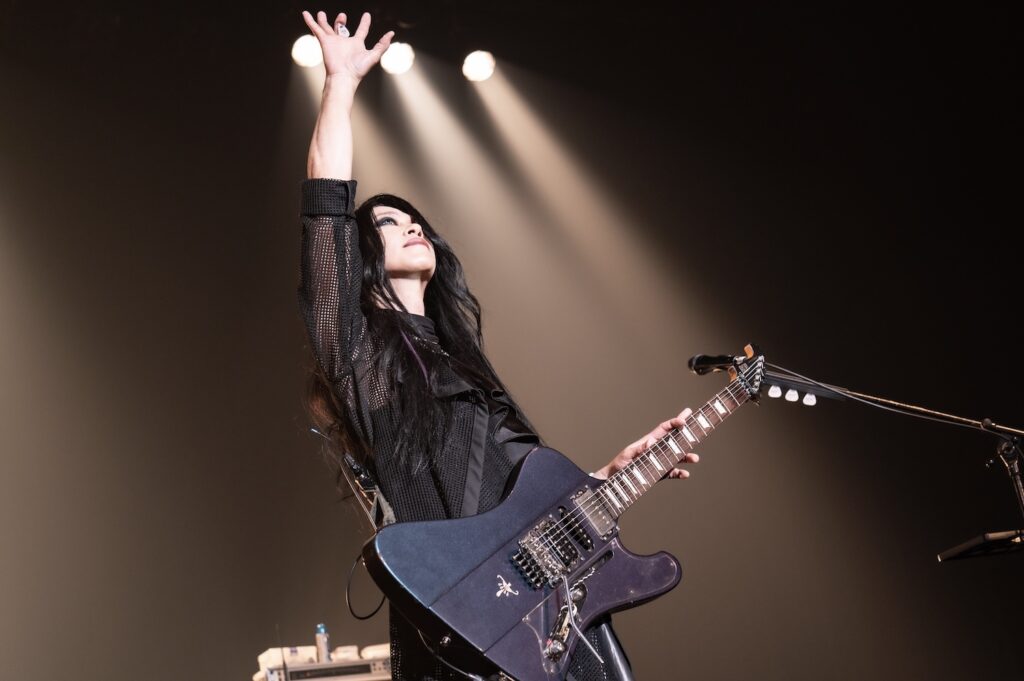 4番手のLa’cryma Christiは、2025年11月より期間限定の再始動中でツアーも行っている。だがツアーのどこのライブとも違うSEと1曲目で臨み、観客は息をのむように引き込まれていく。「PRIDE」も「Subconscious Desire」もKOJI作曲によるもので、ここまでの3バンドとまったく異なる艷やかで扇情的なロックが繰り広げられる。KOJIが弾いていたパートをソロまですべて担当するのはサポートのShinobu(G)で、すでにメンバーや観客から絶大な信頼のもと迎え入れられている。