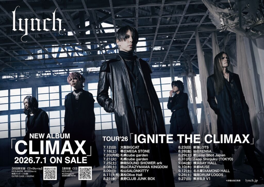 デビュー20周年プロジェクトを12月28日開催の東京ガーデンシアター公演でラストを飾り、21年目に突入したlynch.のニューアルバム『CLIMAX』は、2023年発売の『REBORN』以来3年4か月ぶり、通算12作目となるオリジナルフルアルバム。タイトルの“CLIMAX”は最高潮、最高点を意味しており、その意図やコンセプト、そしてどのような思いが込められているのか。なお進化を続けるlynch.のサウンドが期待できそうだ。新アーティストビジュアルでは朽ち果てた洋館でメンバーが凛と佇んでおり、ダークな世界観の中にも光が差し込む印象的な仕上がりとなっている。
