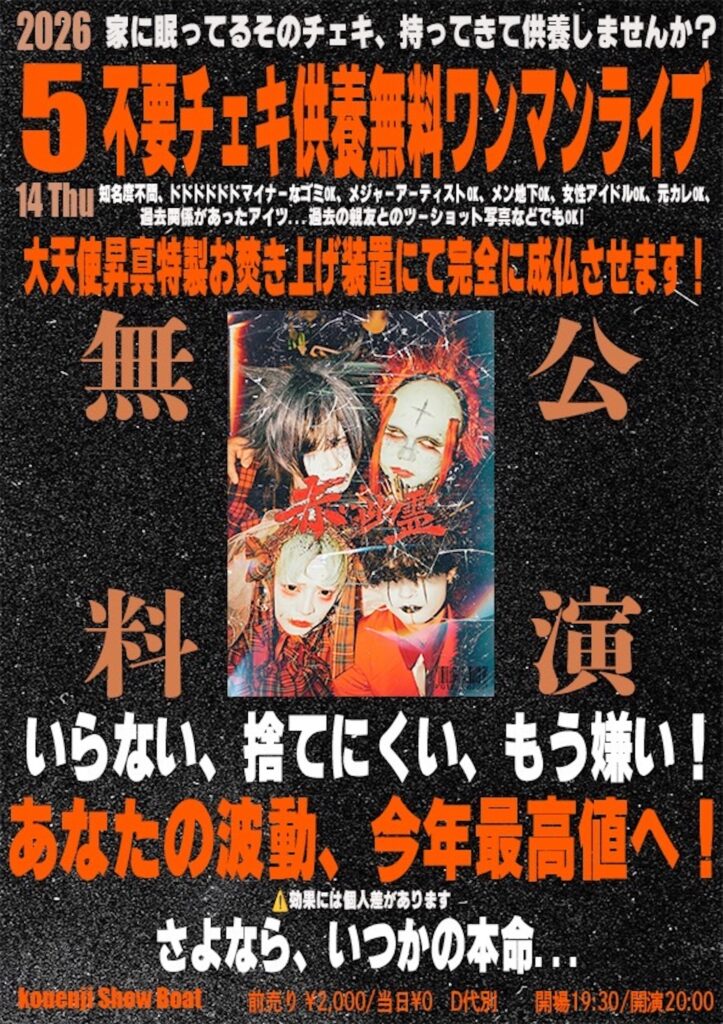 5月14日(木)、赤い幽霊無料ワンマンライブの会場内に“お焚き上げ装置"が出現します。