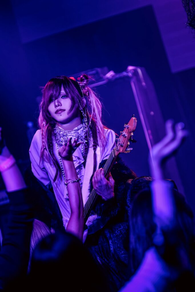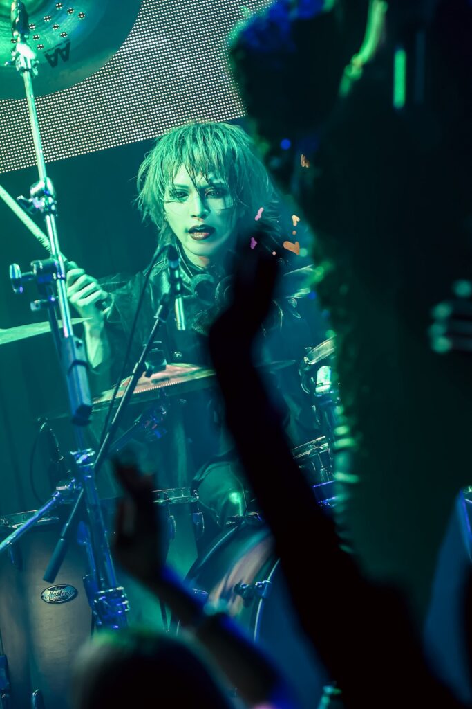 「CRY MORRY」で幕は開く。早くも会場はMAMA.の世界観にどっぷりで、折りたたみや手を挙げることで、メンバーの作り出す空間をファンも盛り上げている。映像もあいまい、ステージに釘付けになる。命依のセンターマンとして、心を全て曝け出すようなパフォーマンスにはいつも目を奪われる。一瞬でも目を離したくないと思わせられるステージングである。かごめも上手で、お客さんを煽るような表情で、アグレッシブに動く姿には華がある。JiMMYのテクニックだけではない、雰囲気をも味方に付けたパフォーマンスが見ていて気持ちが高まる。ギター隊とは異なり、どっしりとした安定感で演奏もステージも守っている真。ゆっくり前後に移動するパフォーマンスでさえ、全てに意味があるように感じられる。